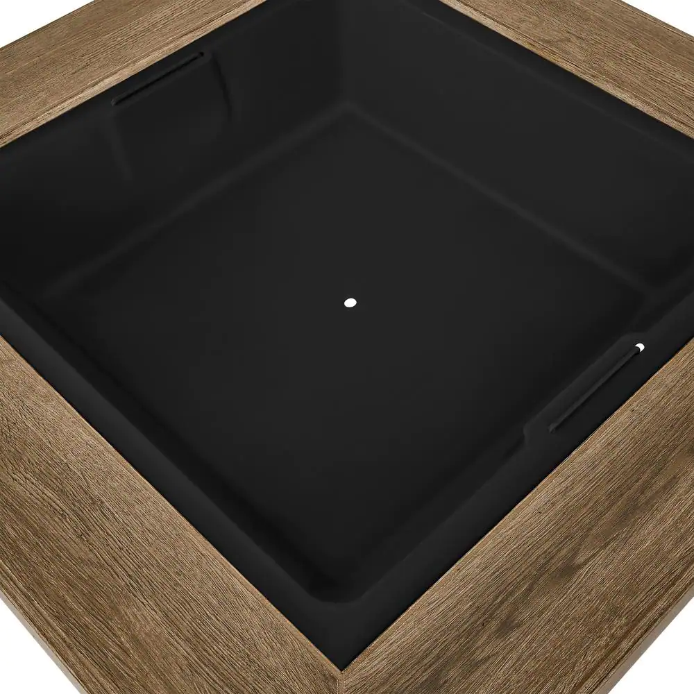 Hampton Bay Stoneham 34 in. x 15.5 in. Square Steel Black Wood Fire Pit With Wood-Look Tile Top