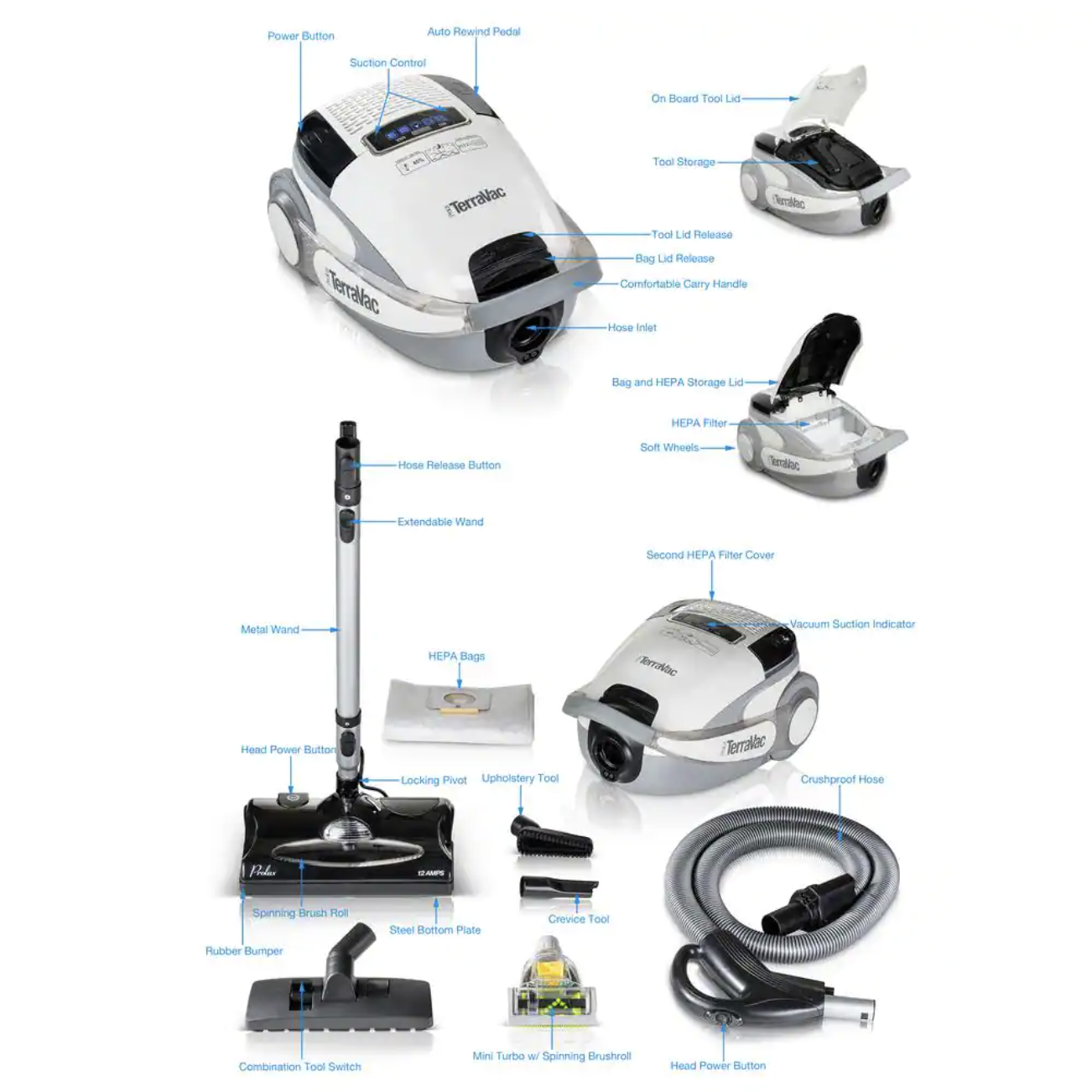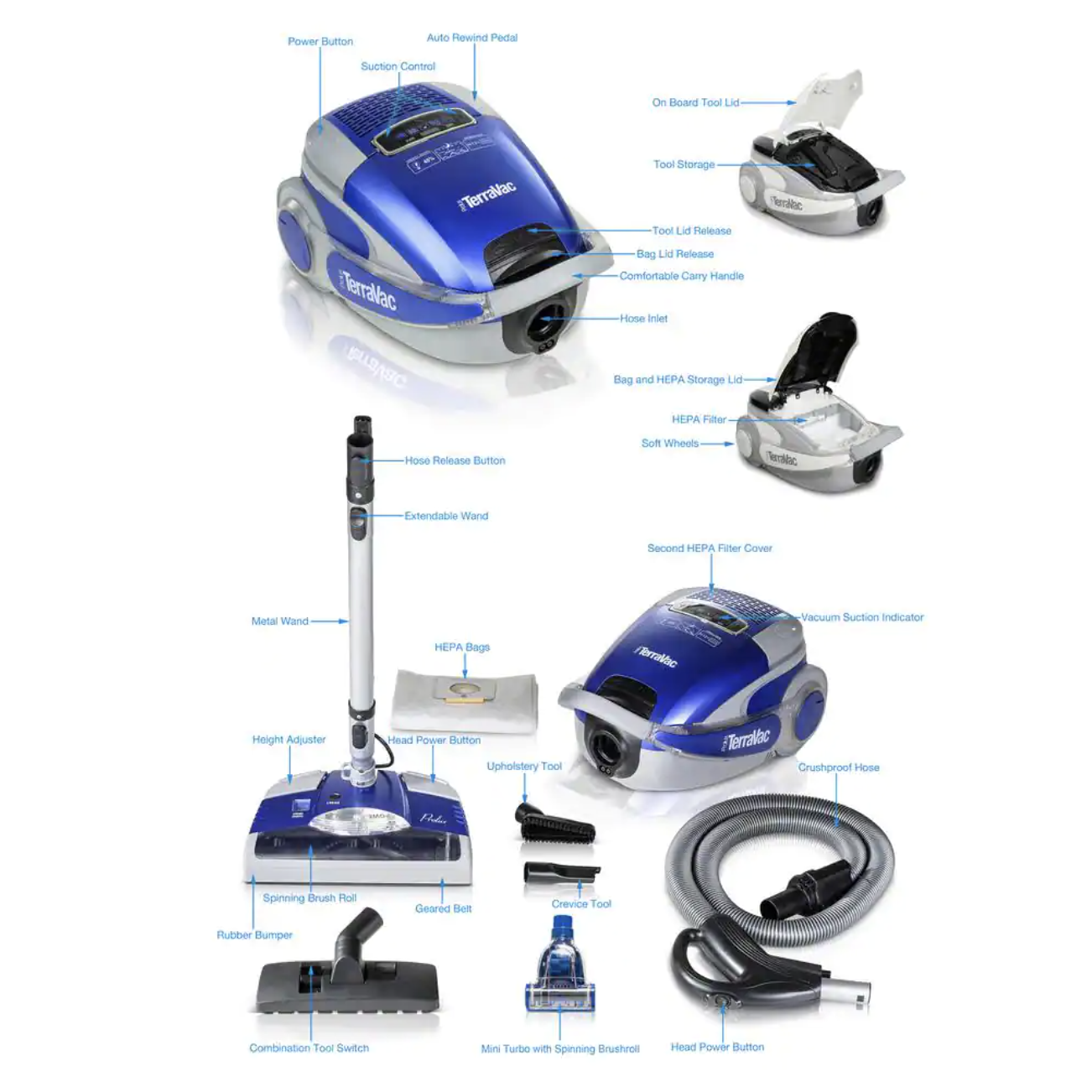 Prolux Blue TerraVac 5 Speed Quiet Vacuum Cleaner with Sealed HEPA Filter and Upgraded Blue Head