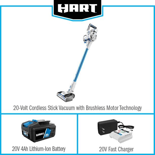 Hart 20-Volt Cordless Stick Vacuum with Brushless Motor Technology. 4.0 Ah Lithium-Ion Battery Included