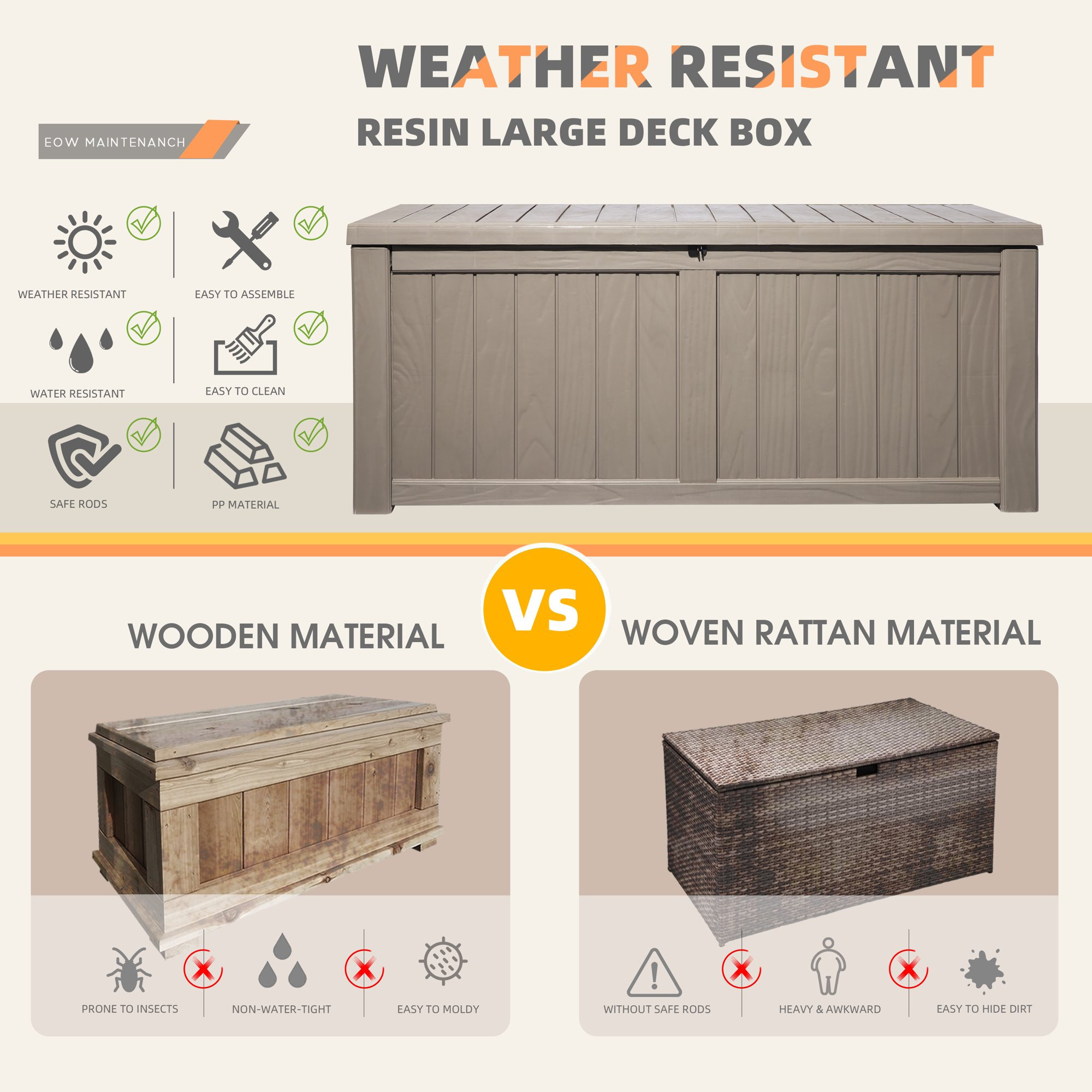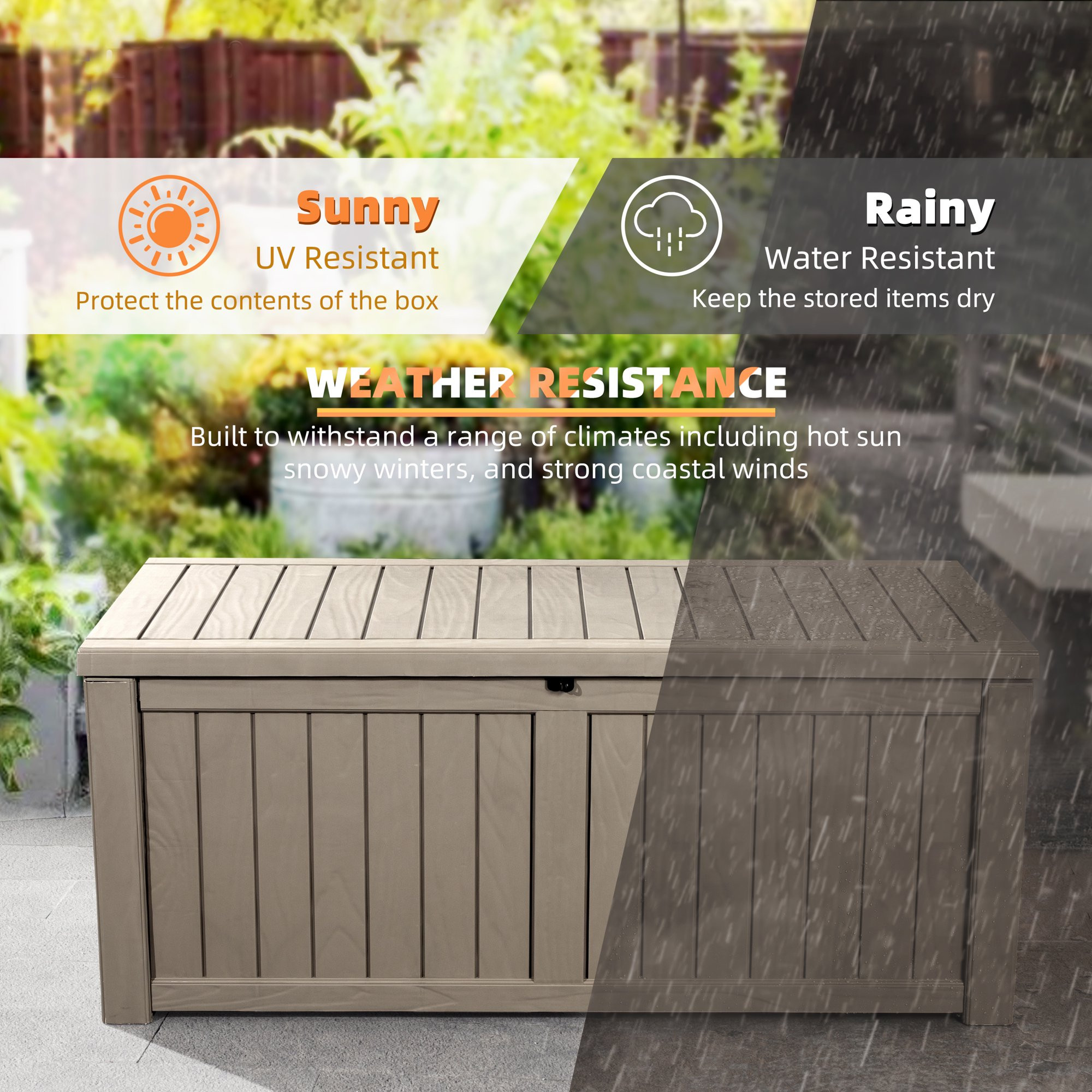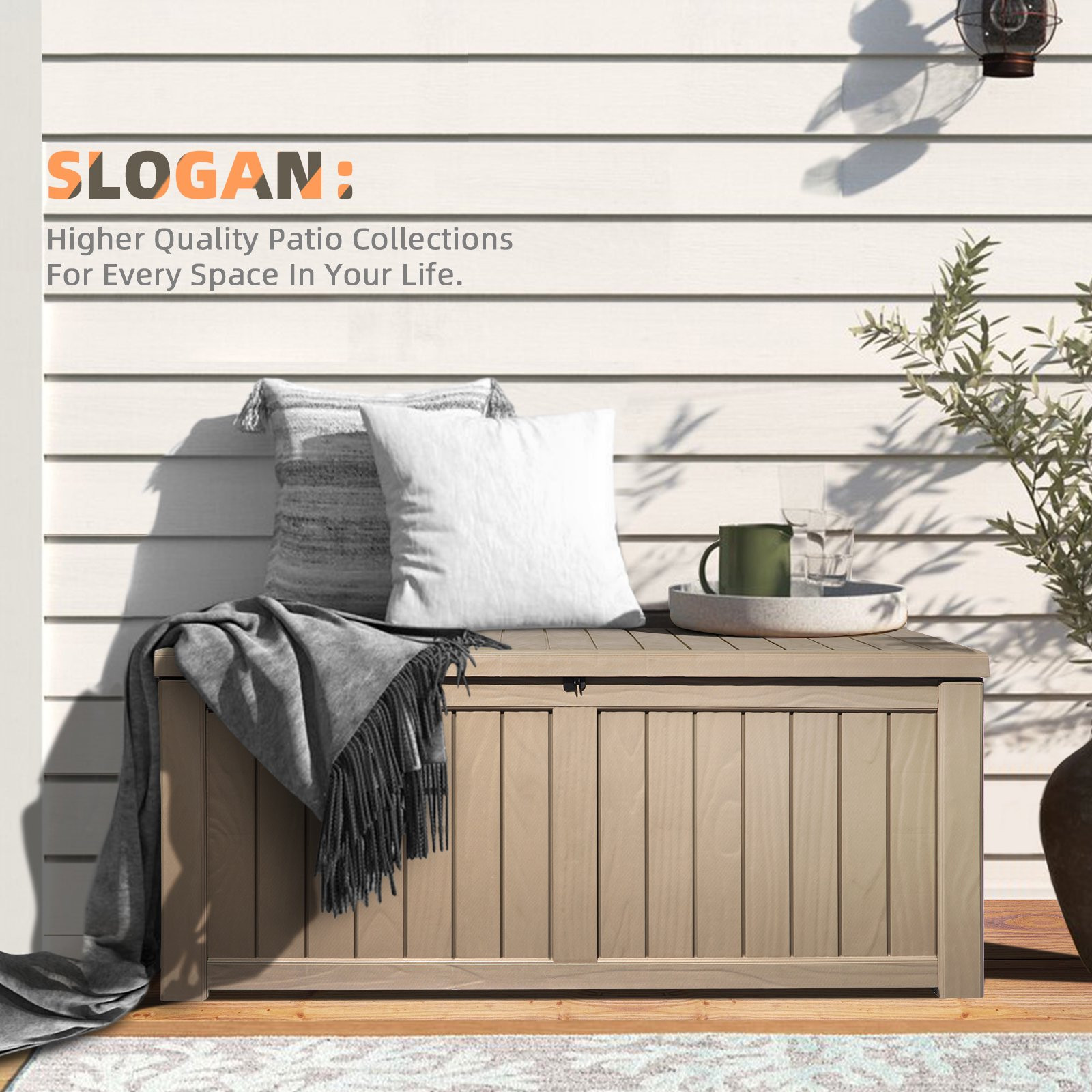 Kutime 120 Gallons Patio Deck Box Resin Wood Grain Storage Box with Cushion. Light Brown