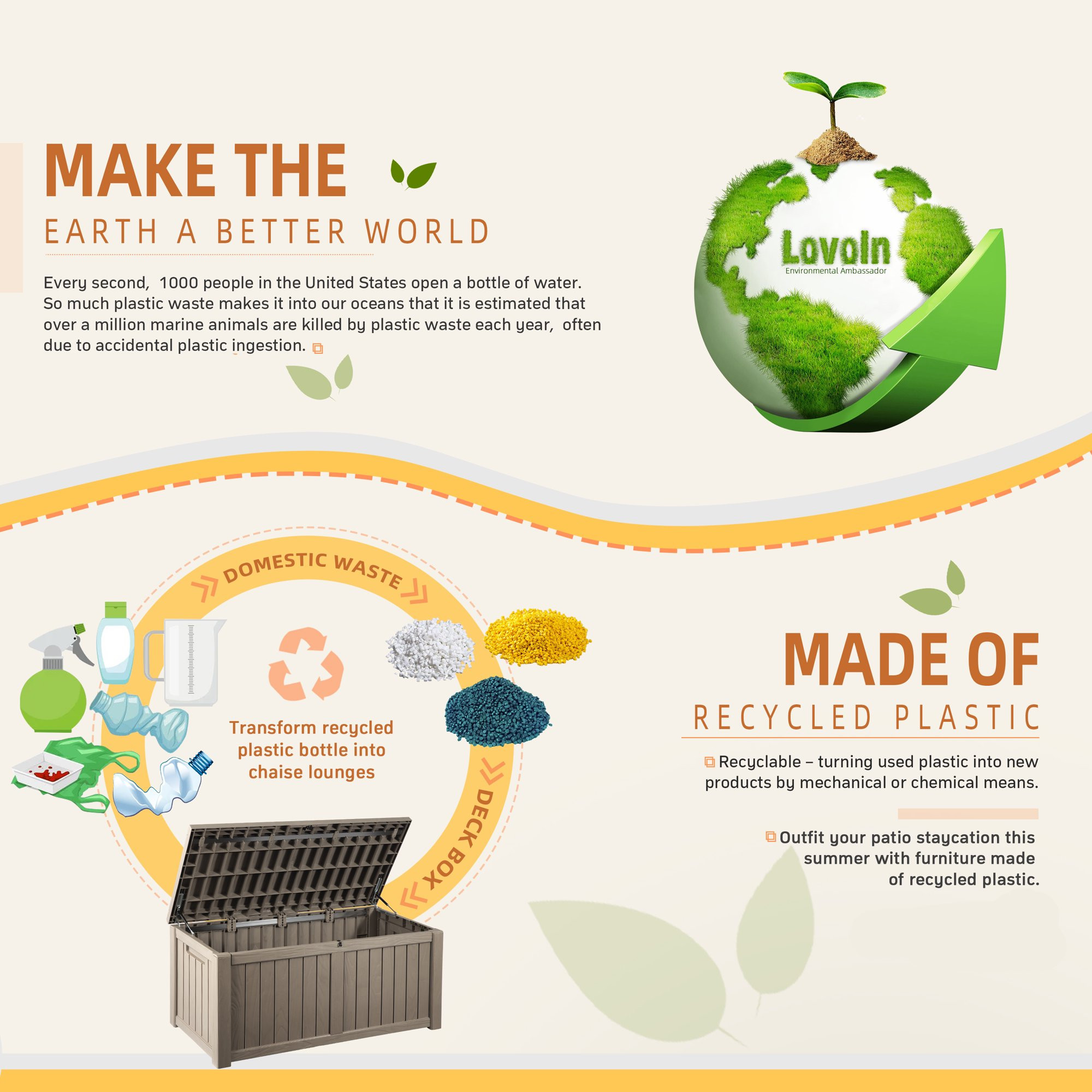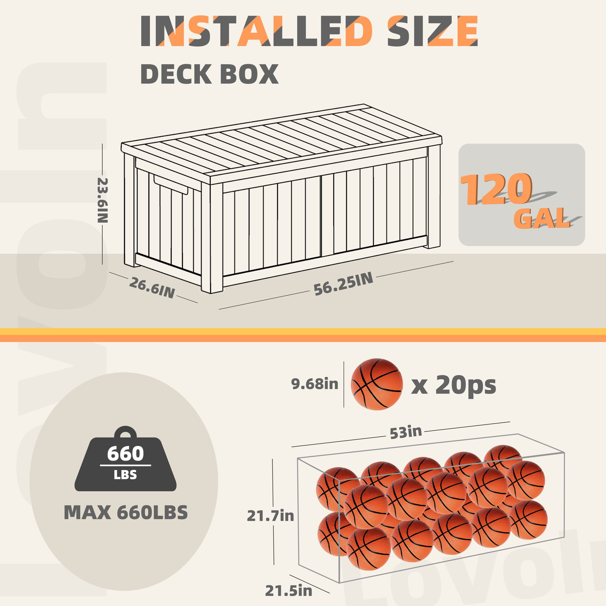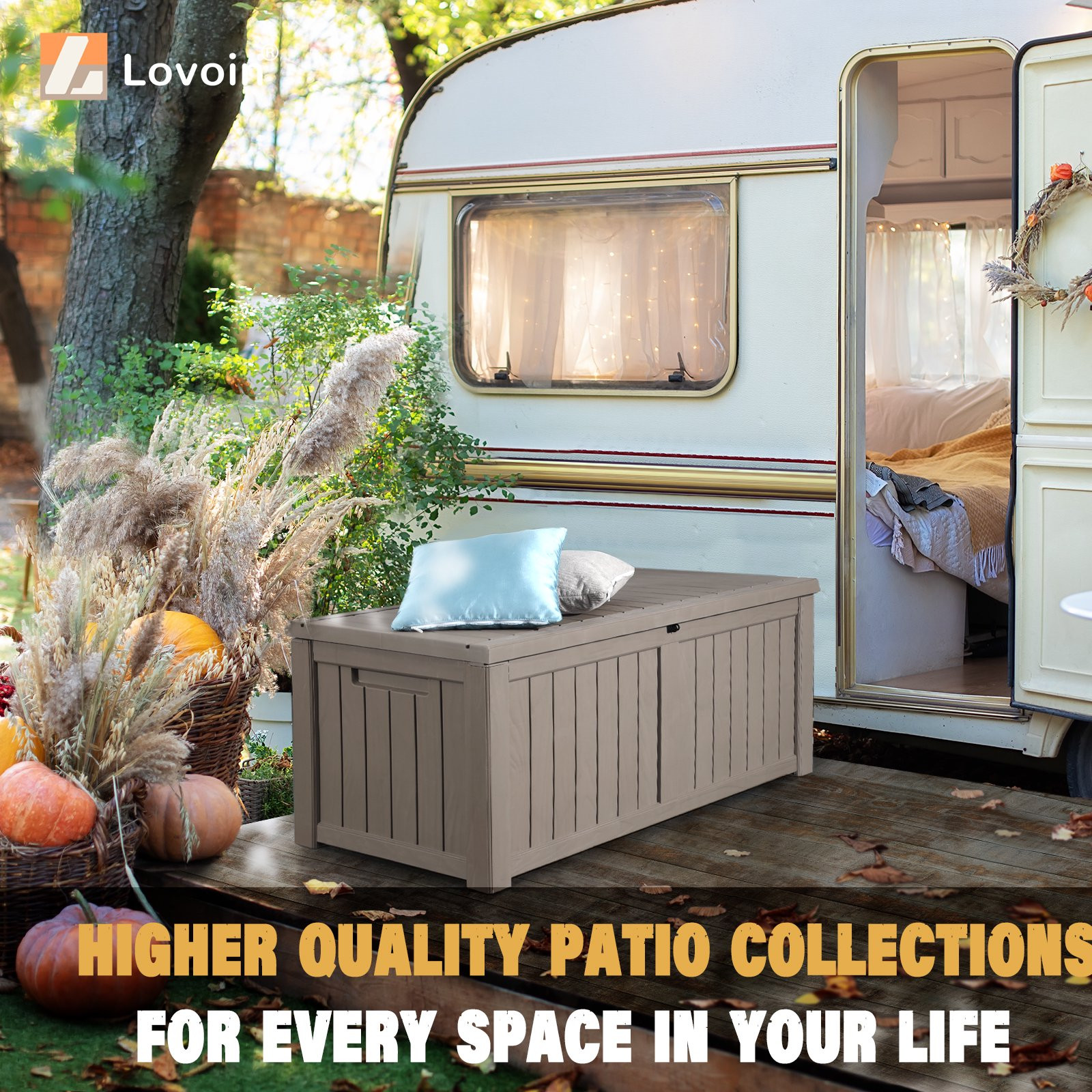 Kutime 120 Gallons Patio Deck Box Resin Wood Grain Storage Box with Cushion. Light Brown