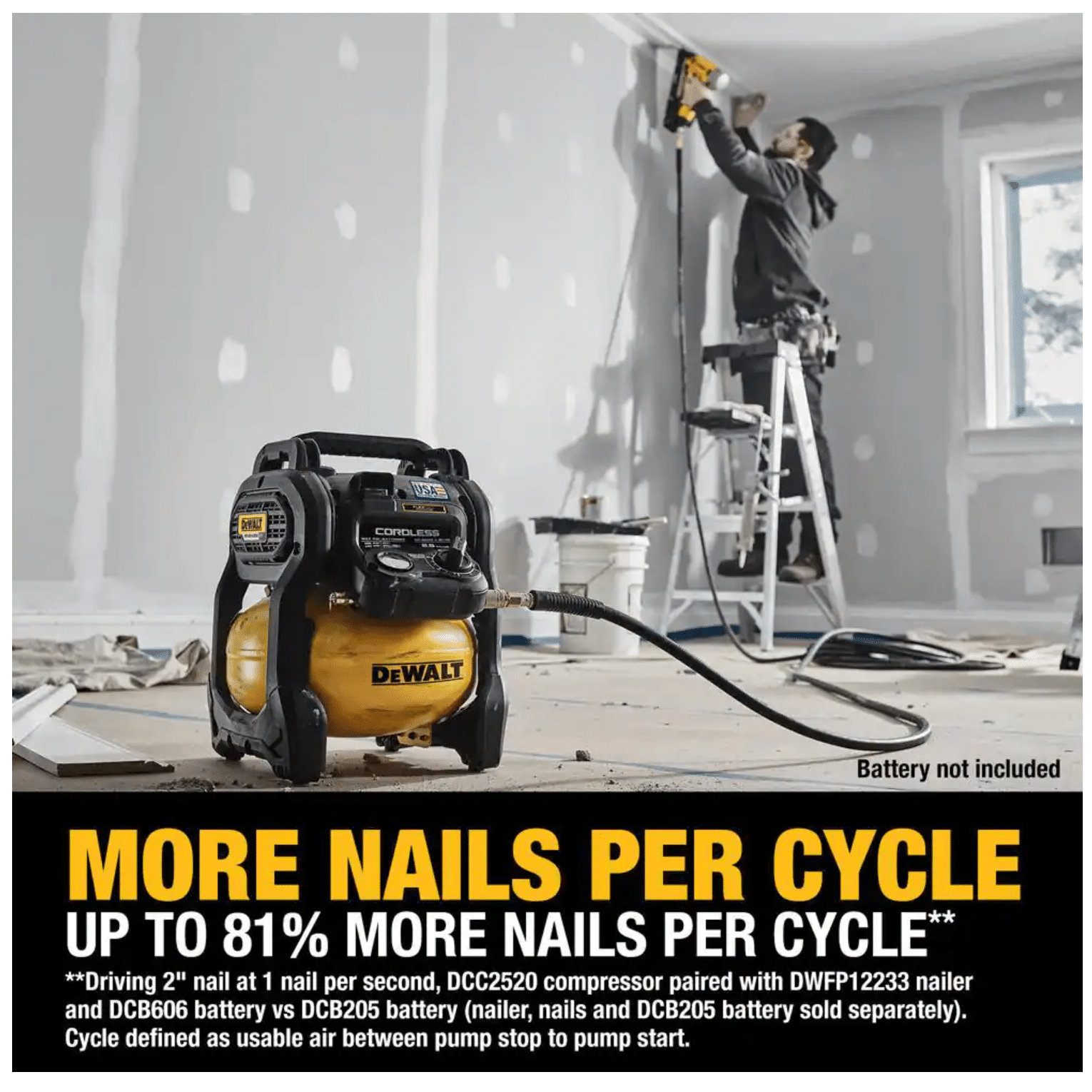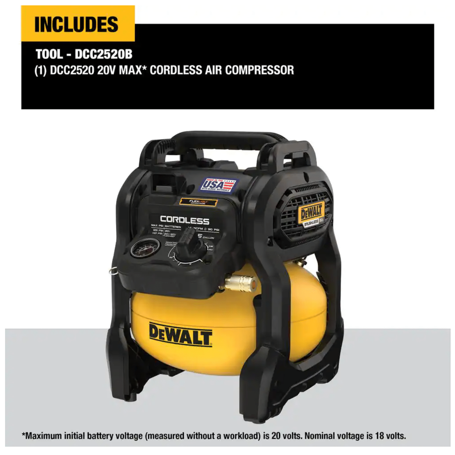 Dewalt 2.5 Gal. 140PSI Portable 20-Volt Cordless Air Compressor with Flexvolt Advantage. Tool-Only (DCC2520B)