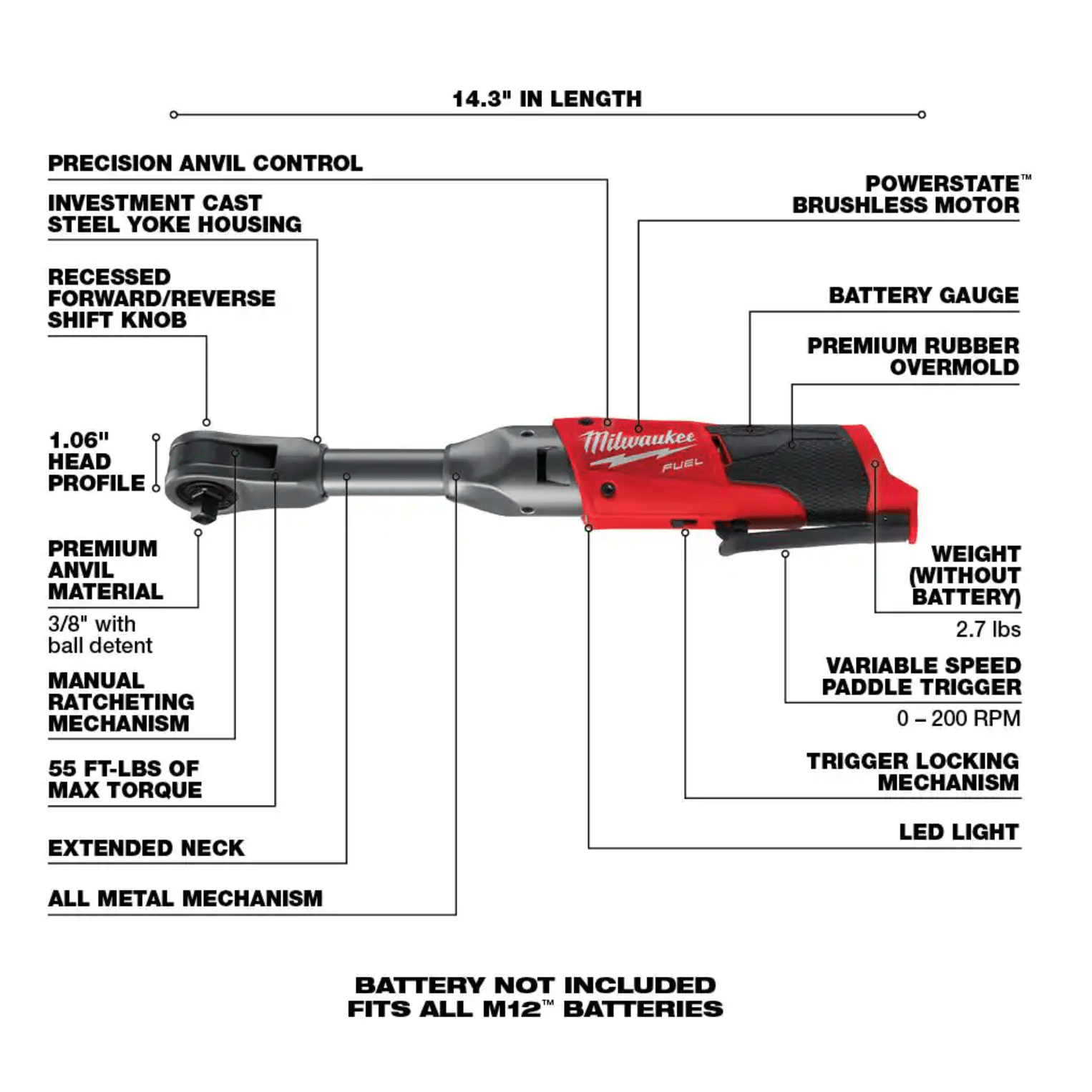 Milwaukee M12 FUEL 12-Volt 3/8 in. Lithium-Ion Brushless Cordless Extended Reach Ratchet. Tool-Only (2560-20)