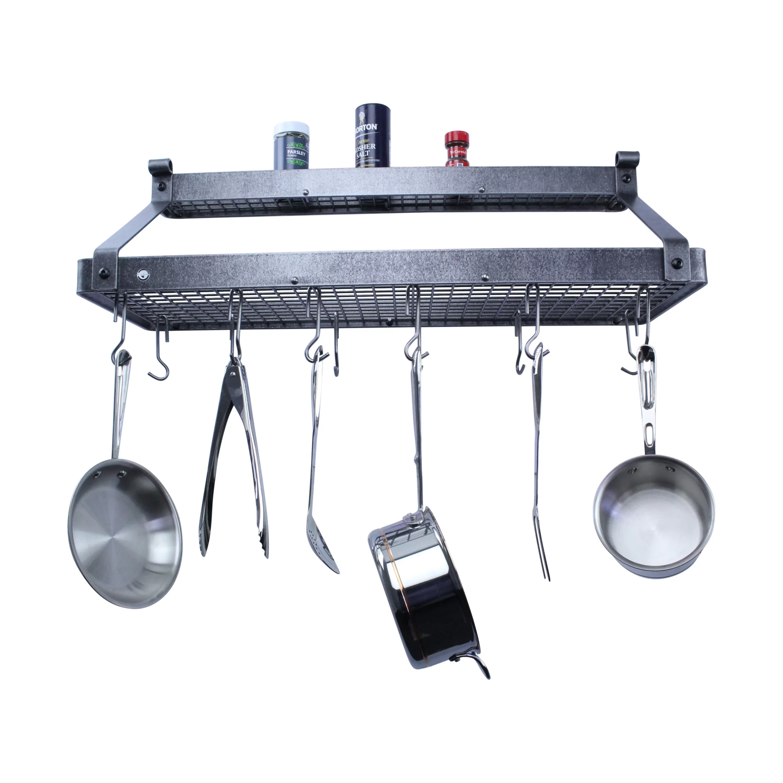 Enclume Gourmet Handcrafted Deep Bookshelf Wall Mounted Pot Rack. Hammered Steel
