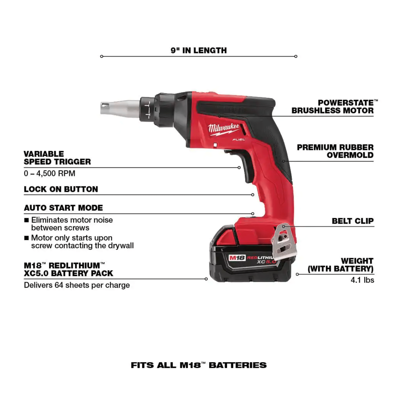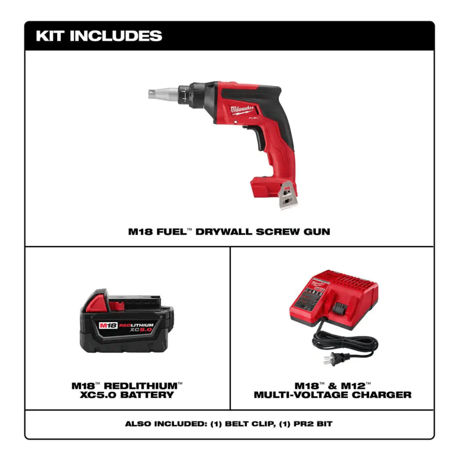 Milwaukee M18 Fuel 18V Lithium-Ion Brushless Cordless Drywall Screw Gun and Starter Kit with 5.0 Ah Battery and Charger (2866-20-48-59-1850)