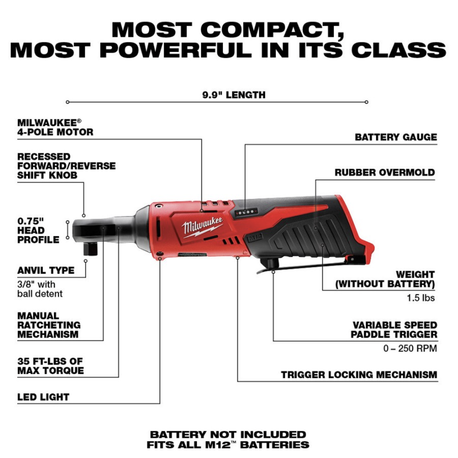 Milwaukee M12 Cordless 3/8″ Ratchet. Tool Only (245720)