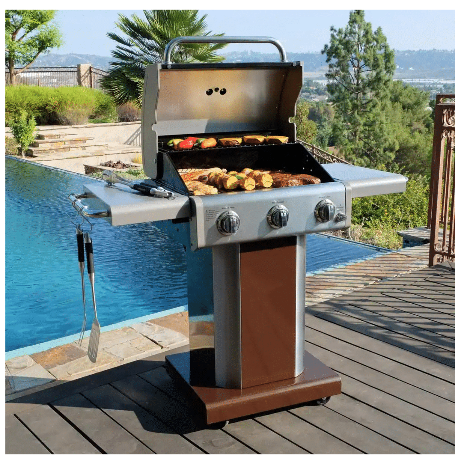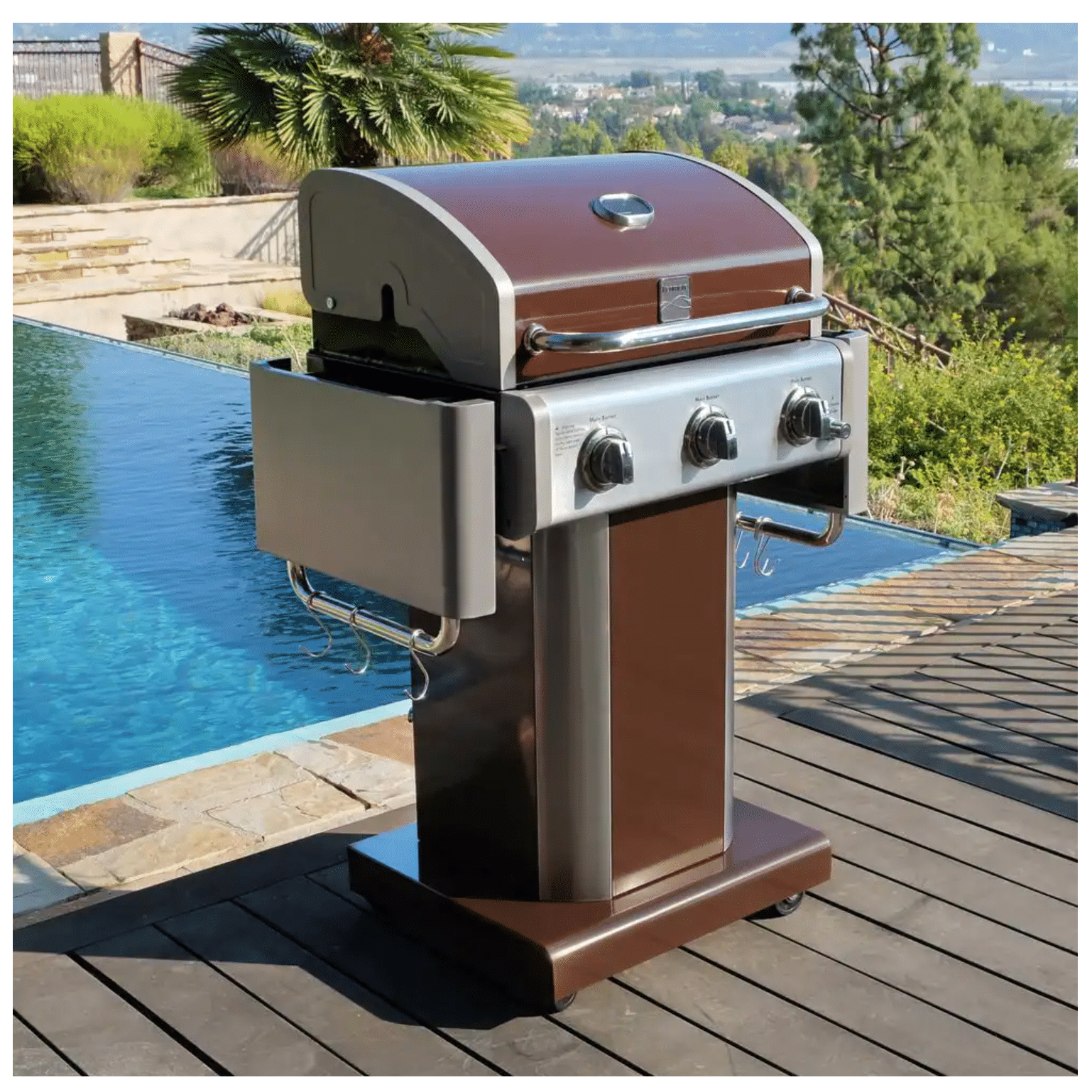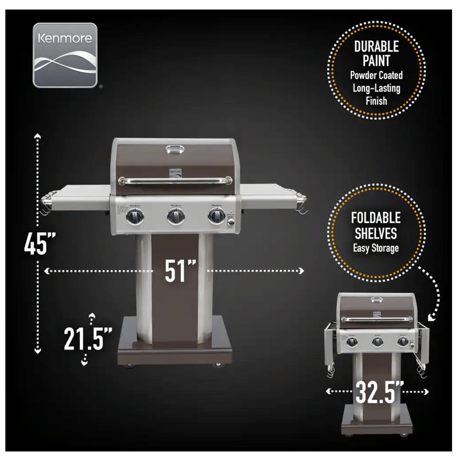 Kenmore 3-Burner Propane Gas Pedestal Grill with Folding Side Shelves in Mocha with 4-Wheels