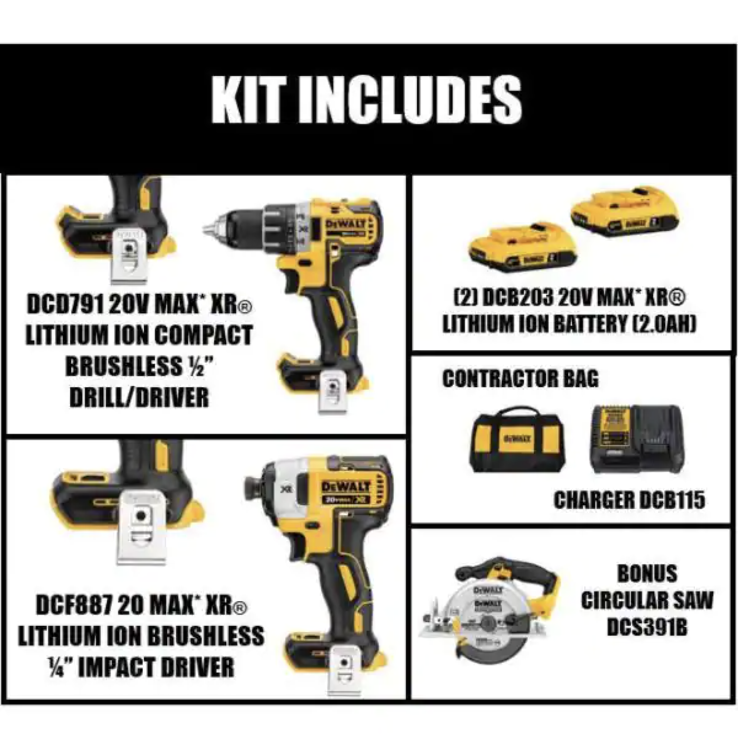 Dewalt 20V MAX XR Cordless Brushless Drill/Impact Combo Kit with (2) 20V 2.0Ah Batteries & Circular Saw (DCK283D2W391B)
