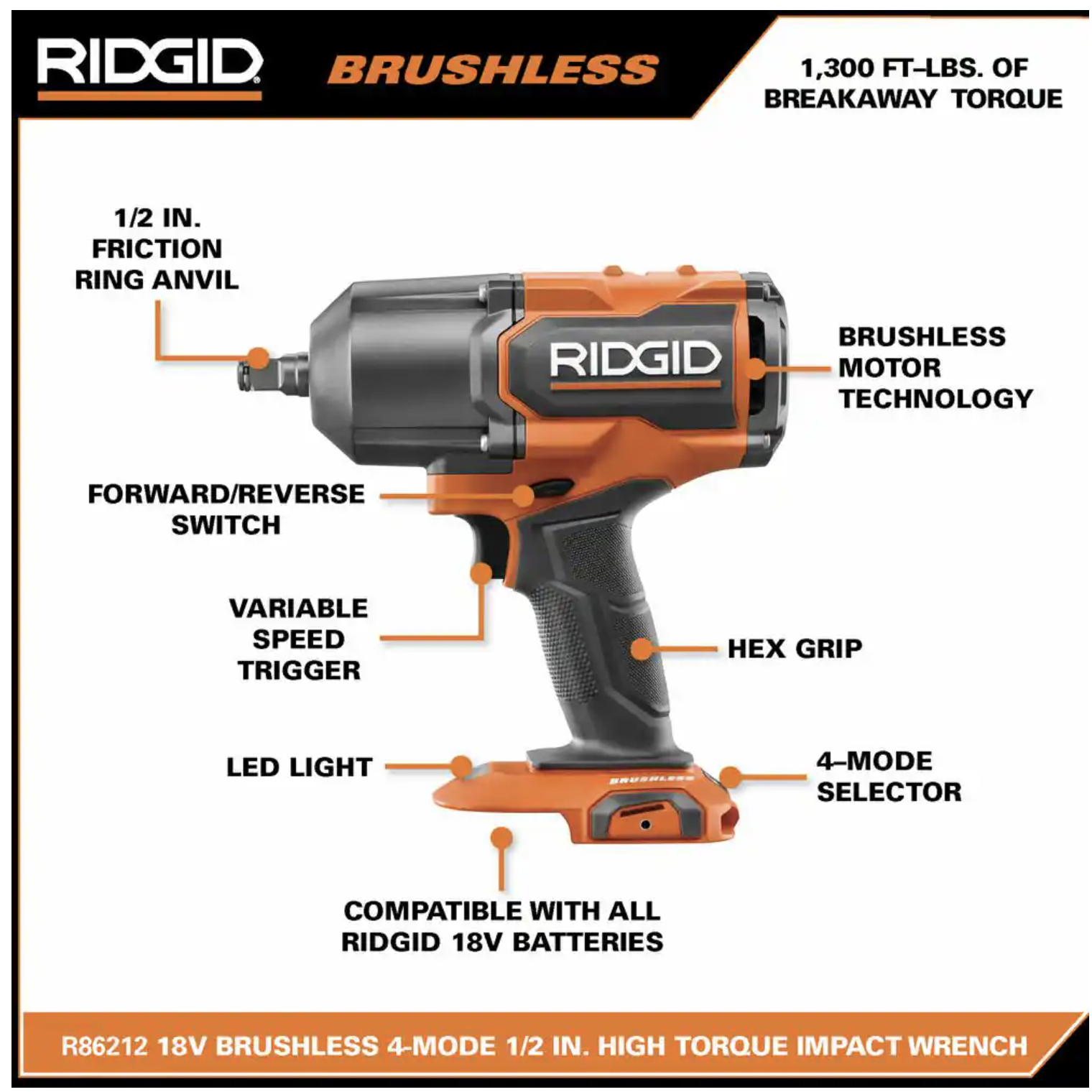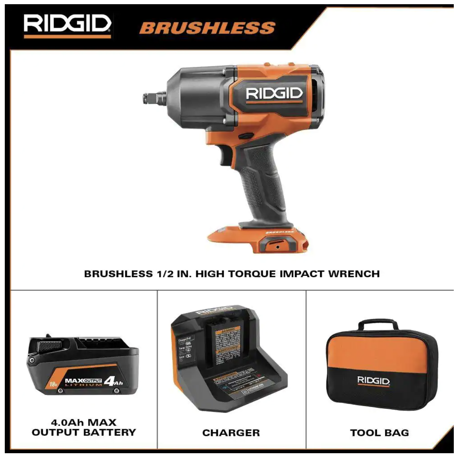 Ridgid 18V Brushless Cordless 4-Mode 1/2 in. High-Torque Impact Wrench Kit with 4.0 Ah Battery and Charger