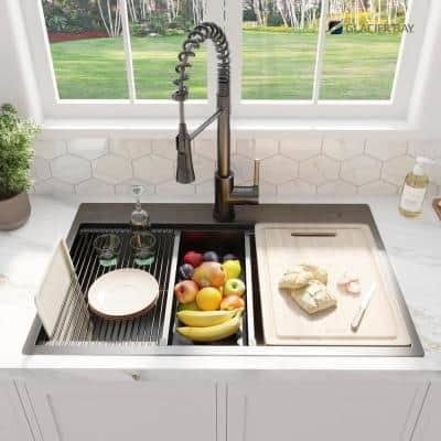 Glacier Bay 30 in. Gunmetal Black Stainless Steel Single Bowl Dual Mount Workstation Kitchen Sink with Black Spring Neck Faucet