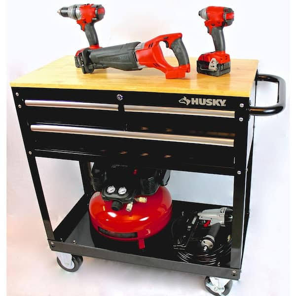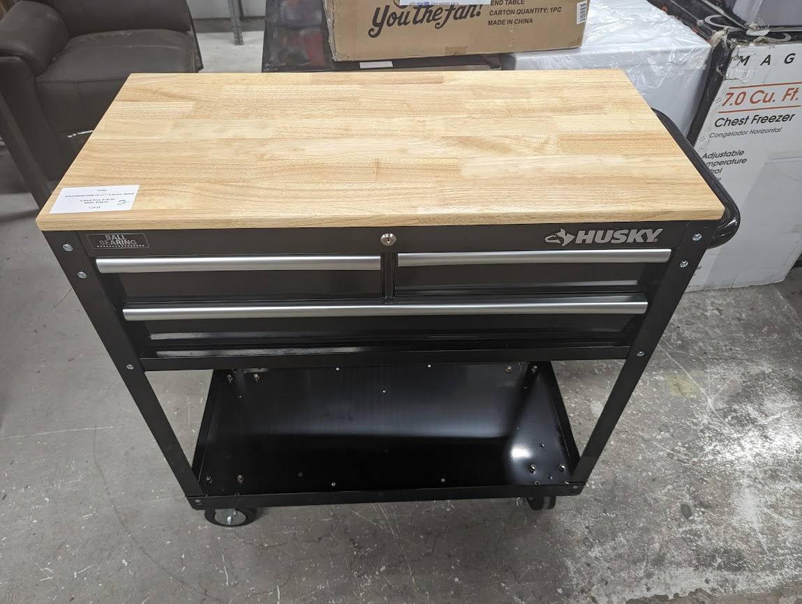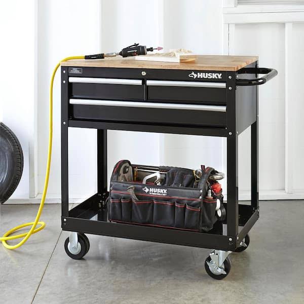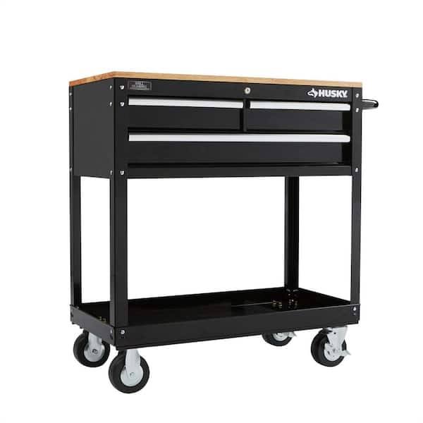 Husky HOUC3603B1QWK 36 in. 3-Drawer Rolling Tool Cart with Wood Top, Black