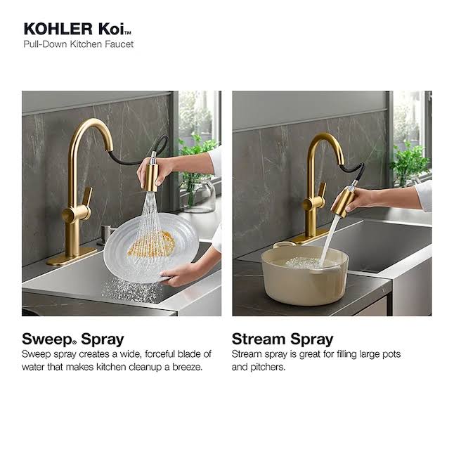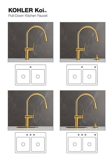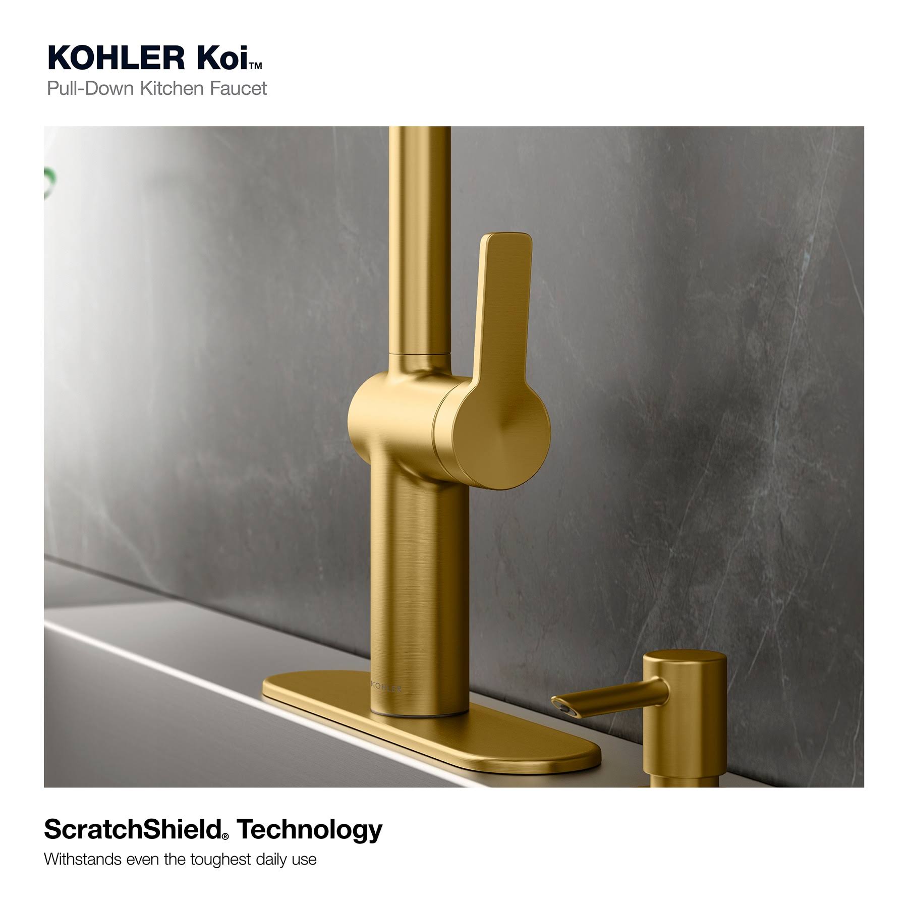 Kohler Koi Vibrant Brushed Moderne Brass Single Handle Pull-Down Kitchen Faucet with Deck Plate and Soap Dispenser Included | K-R22940-SD-2MB