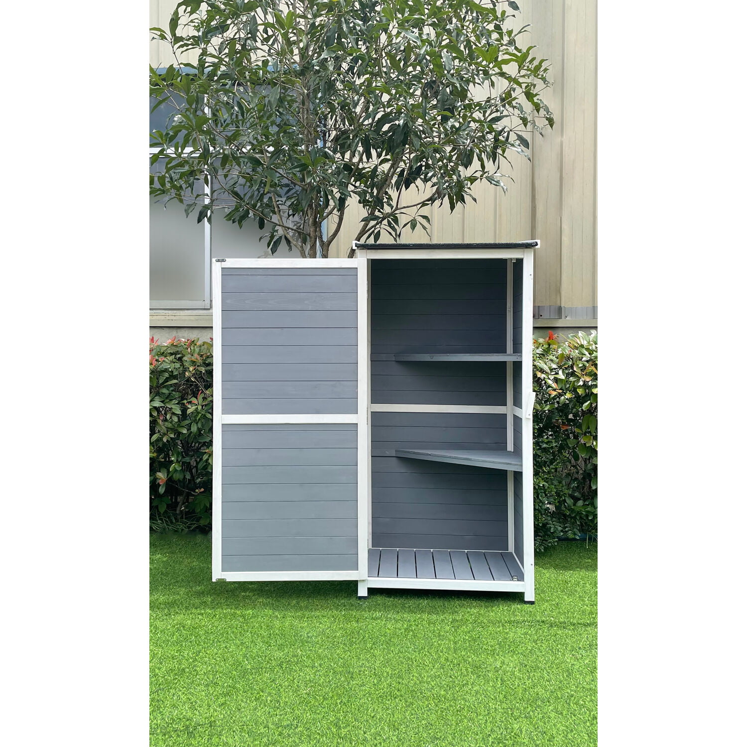 Hanover Outdoor Vertical Wood Storage Shed with Shelves | Backyard Utility Storage Unit for Organizing Garden Supplies. Patio Accessories & Tools | Grey