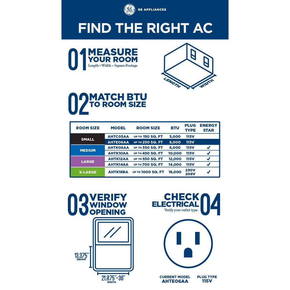 GE AHTE06AA 6.000 BTU 115-Volt Window Air Conditioner for Bedroom or 250 sq. ft. Rooms in White with Remote. Included Install Kit