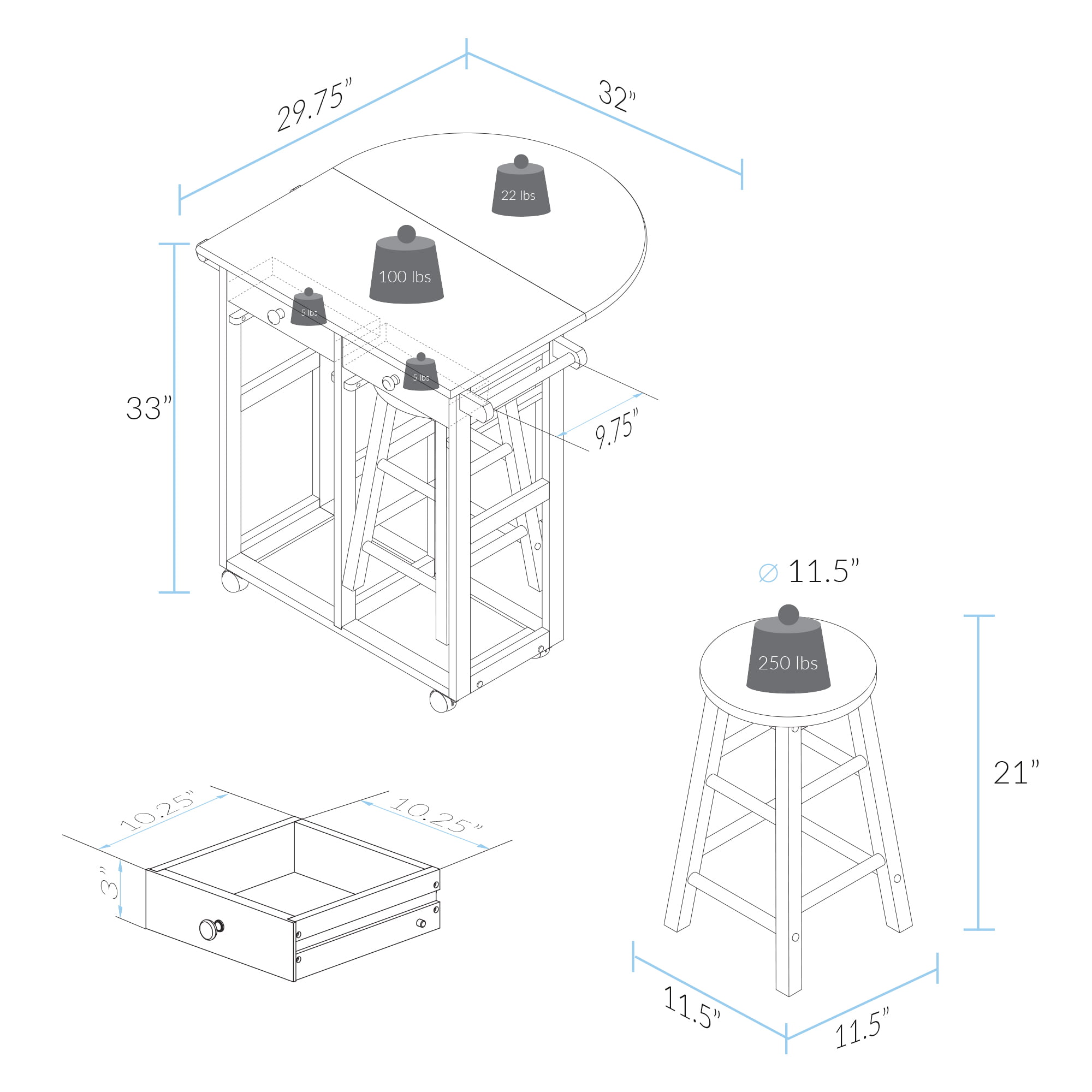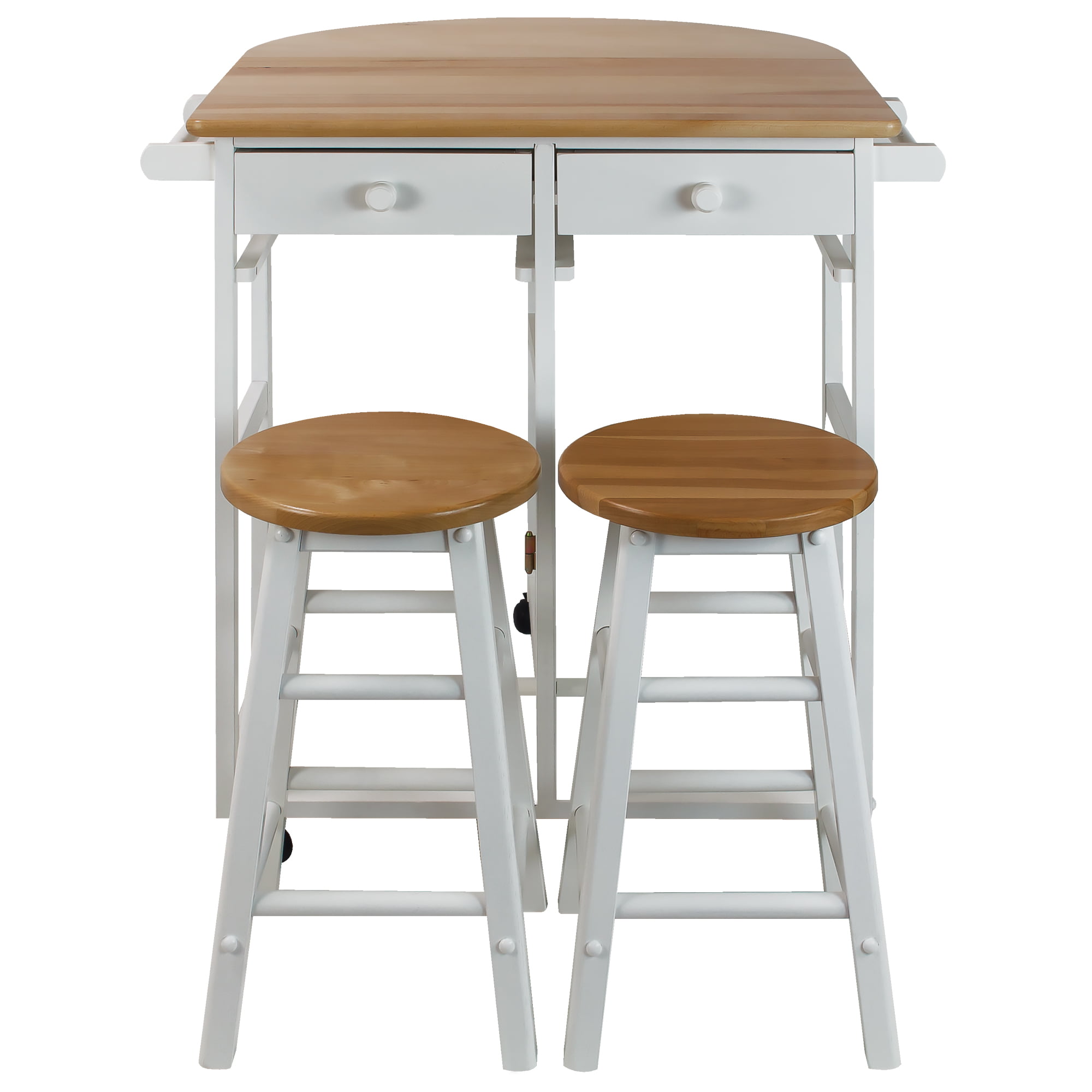 Casual Home New Folding 3-Piece Space Saving Dining Table Rolling Cart with Drawer and Two Stools. Two-Tone Finish (Natural White)