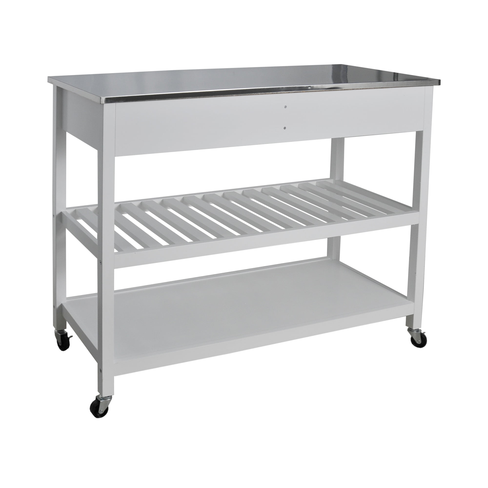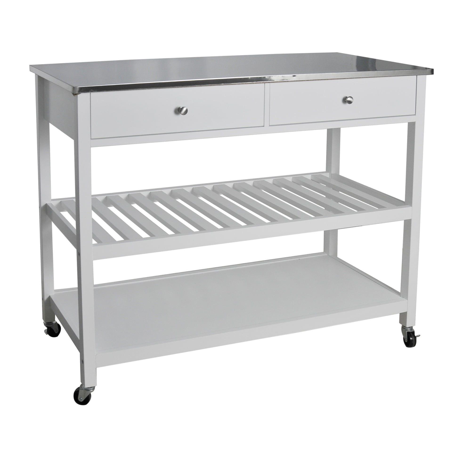 Redmon Mobile Kitchen Island With Two Large Open Shelves. Two Drawer. Stainless Steel Top. White Finish