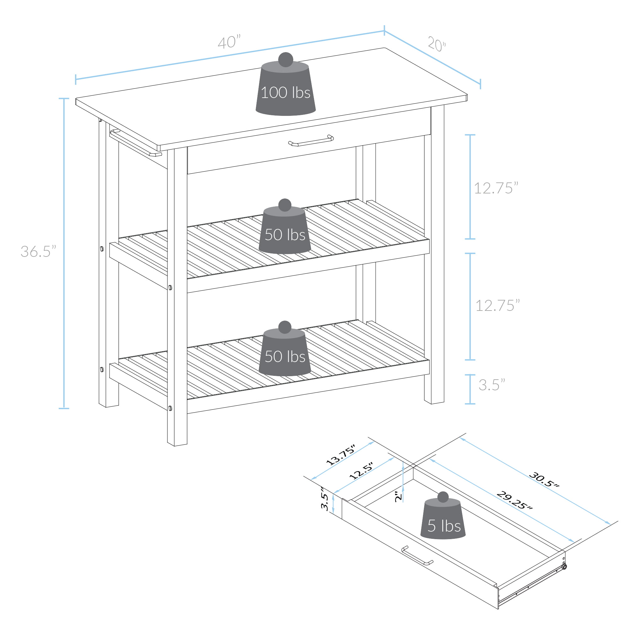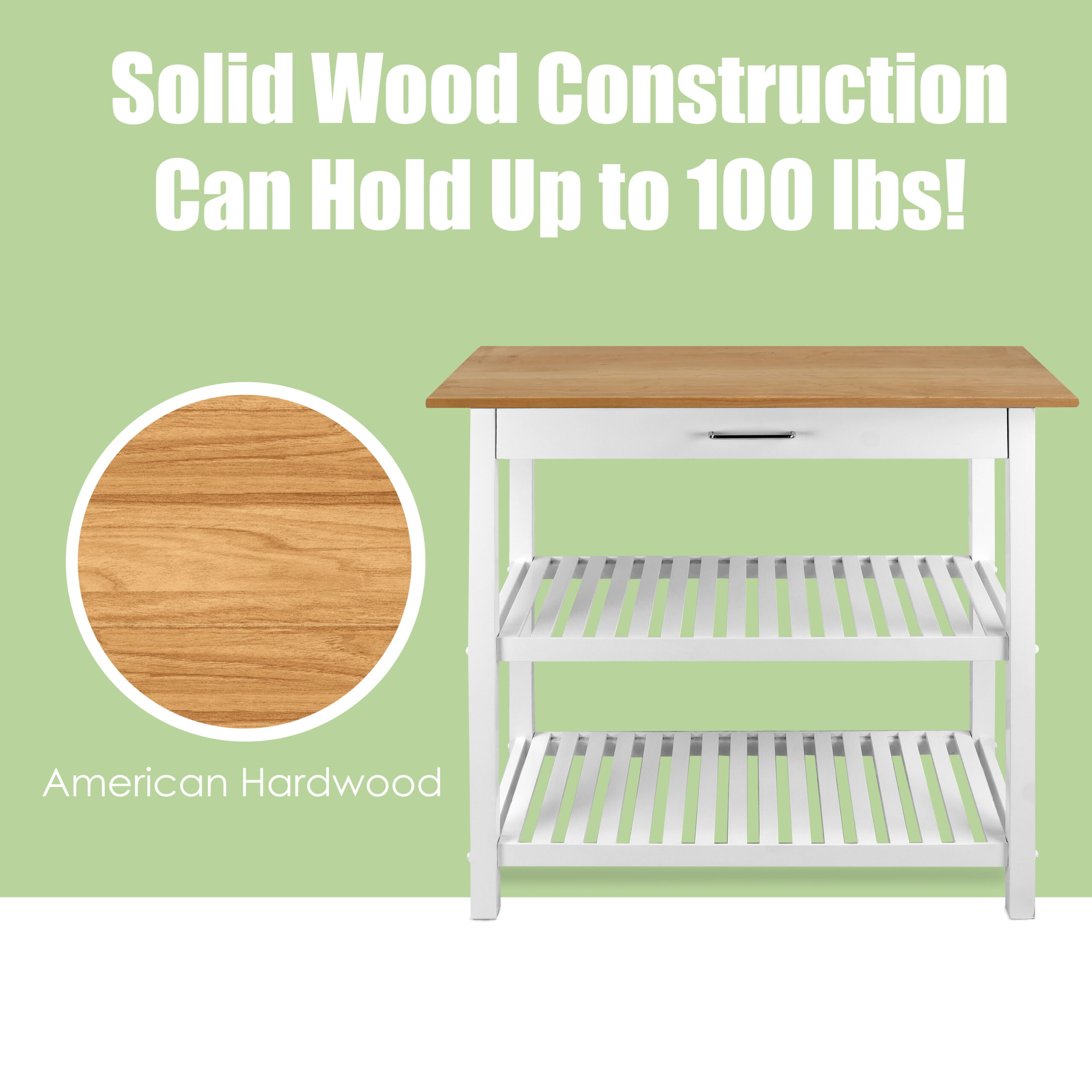 Casual Home Solid Wood 40″W Kitchen Island with Drawer. Two Shelves. and Towel Racks. American Maple Top. Two-Tone Finish (Natural White)