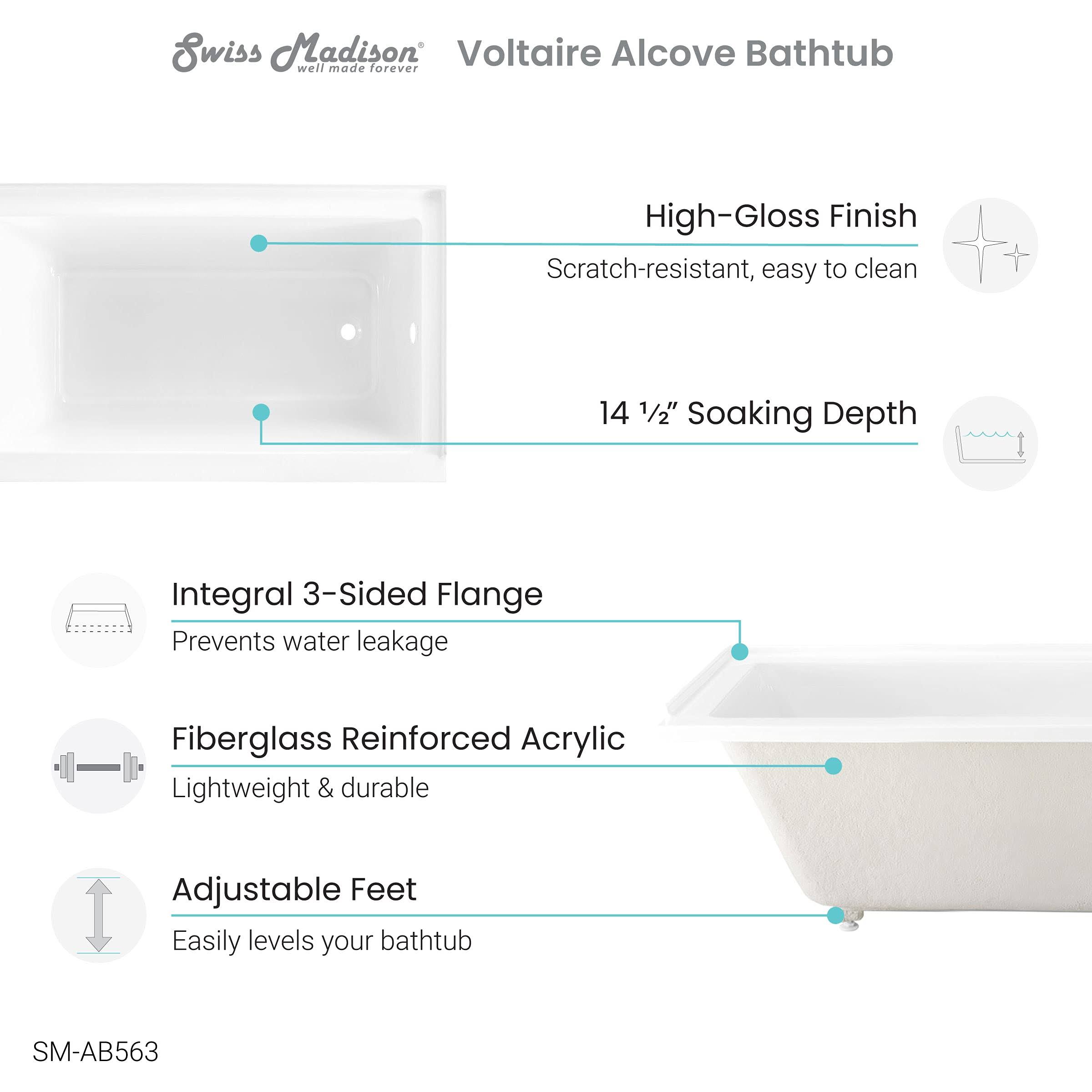 Swiss Madison Voltaire 54 in x 30 in Acrylic Glossy White, Alcove, Integral Right-Hand Drain, Bathtub SM-AB563