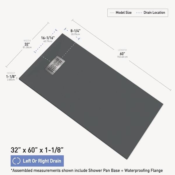 CASTICO 60 in. L x 32 in. W x 1.125 in. H Solid Composite Stone Shower Pan Base with L/R Drain in Graphite Slate, Graphite/Slate