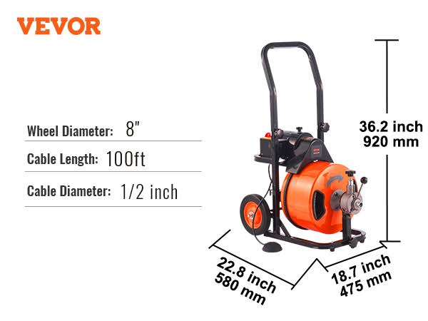 VEVOR Drain Cleaning Machine 100 ft. x 1/2 in. Drain Auger Cleaner Auto Feed with Sewer Snake 4 Cutter for 1 in. to 4 in. Pipe