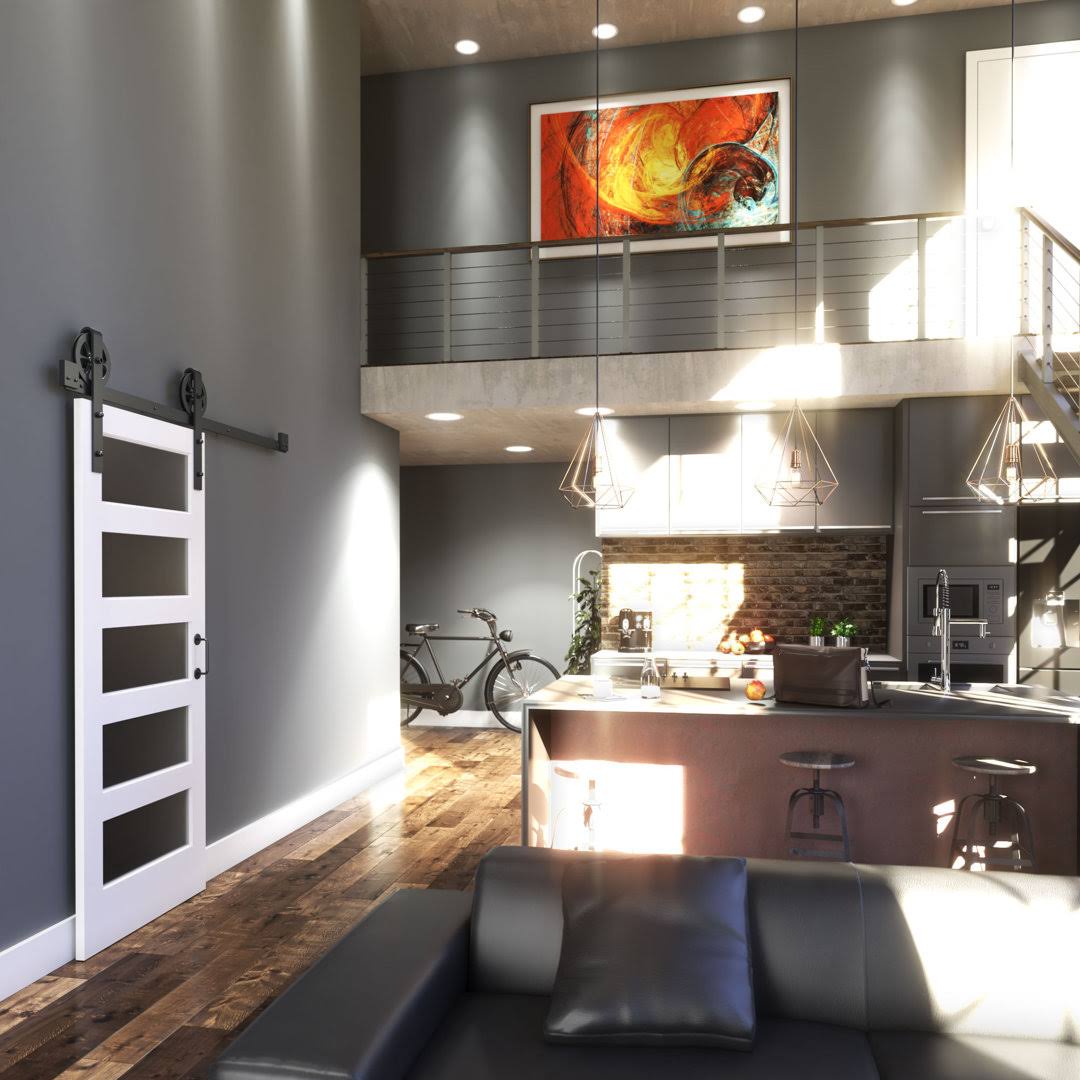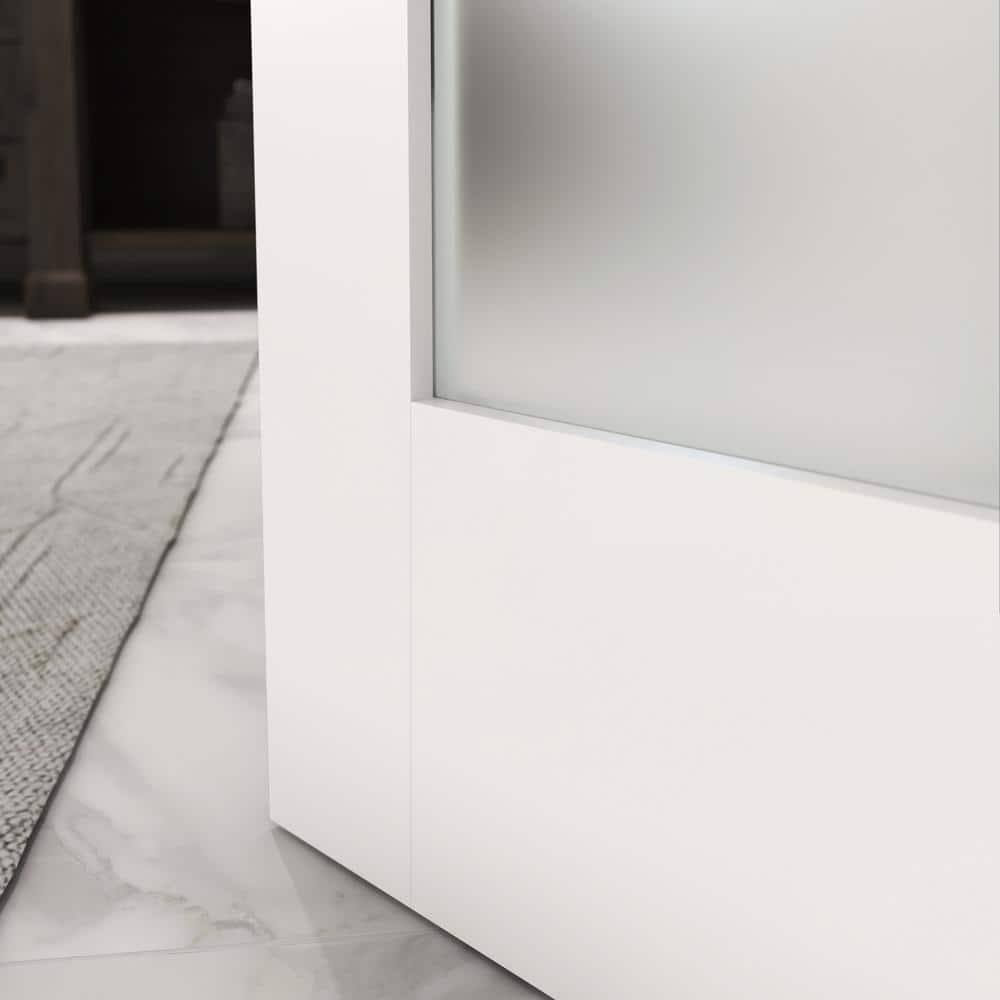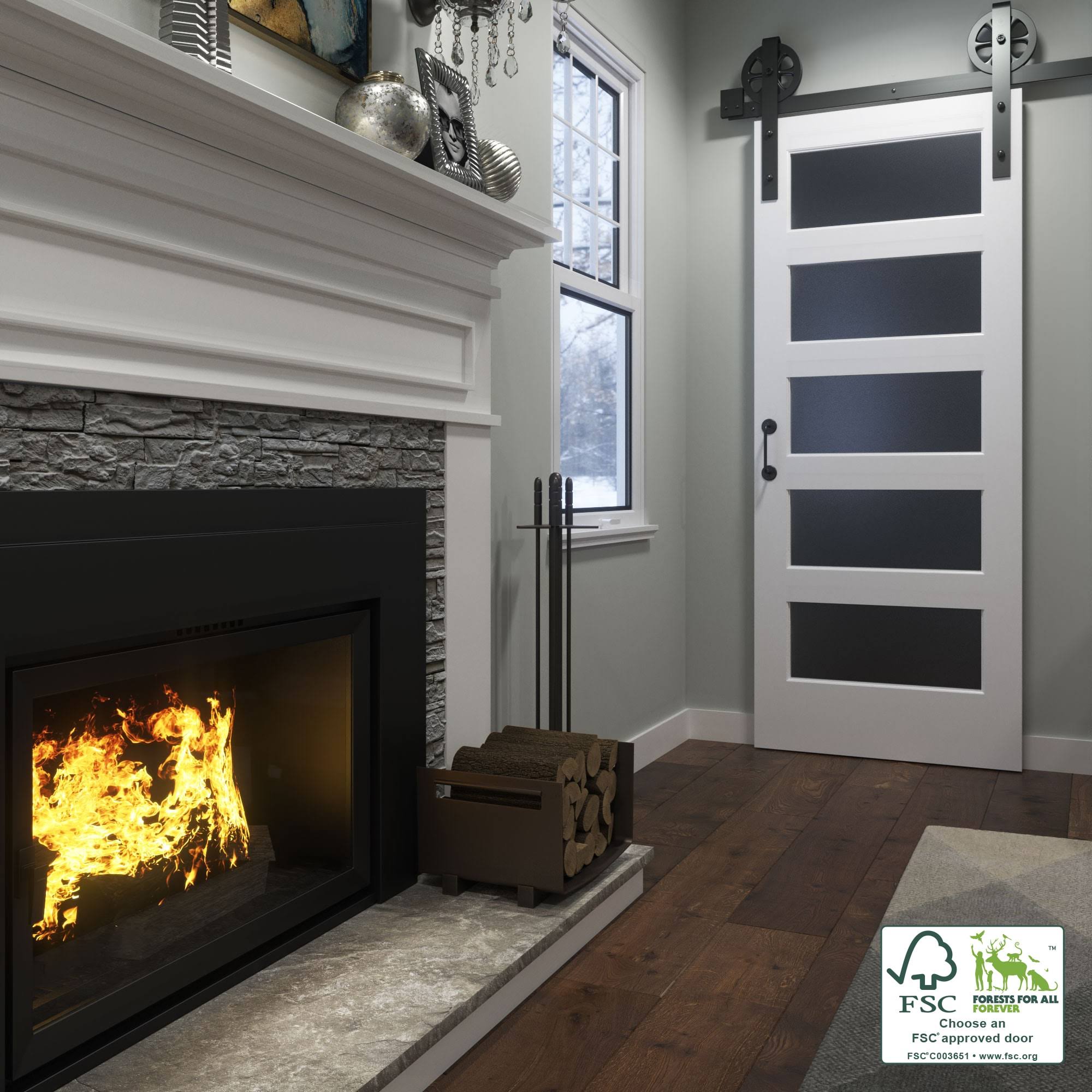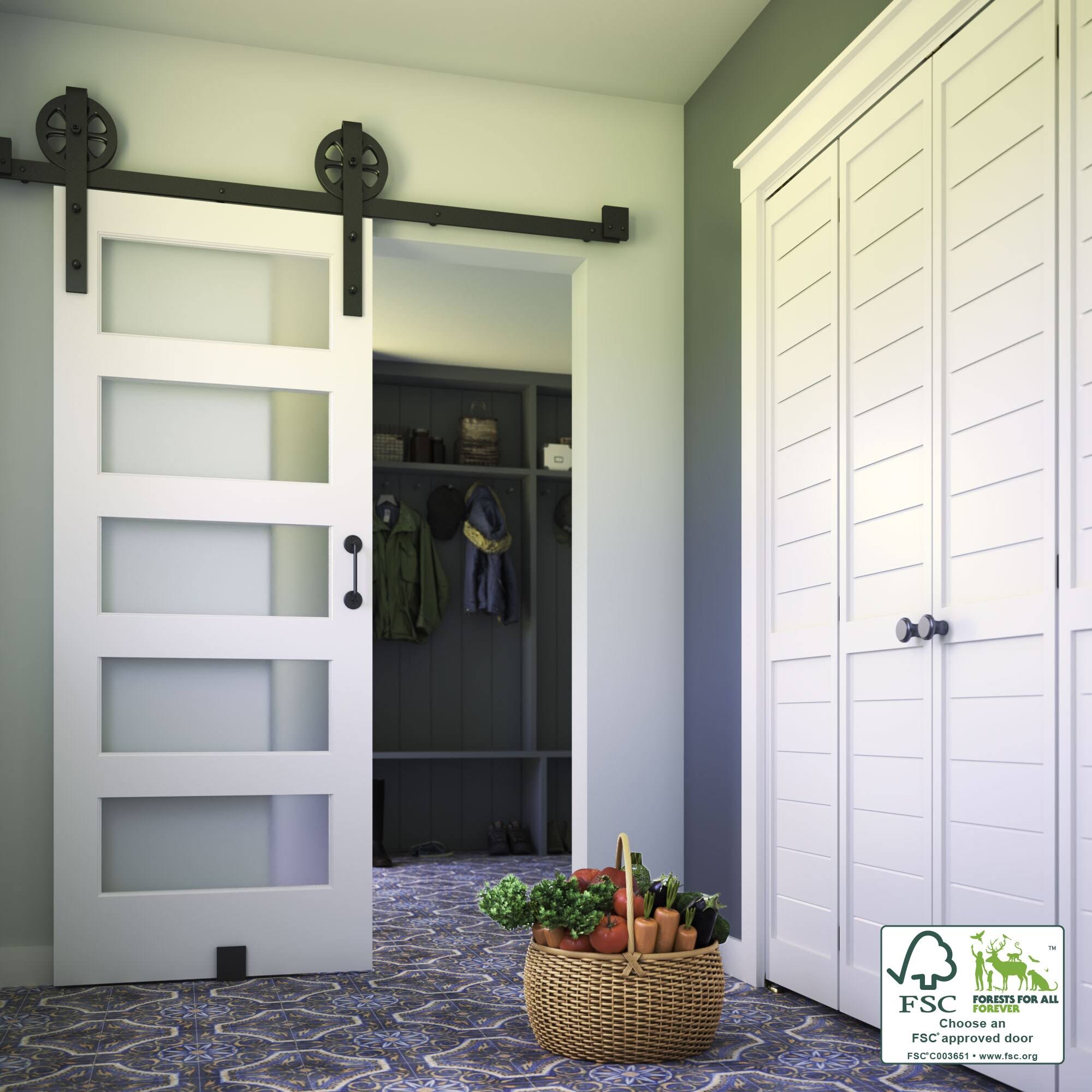 EightDoors 96 inch x 36 inch 5-Lite Frosted Glass White Prefinished Solid Wood Core Barn Door