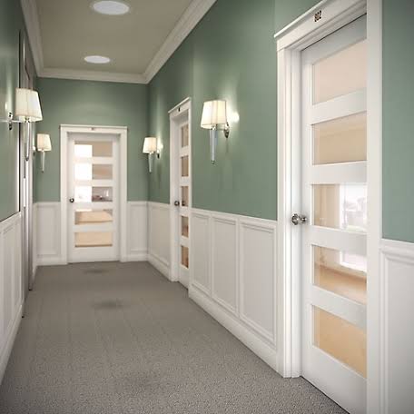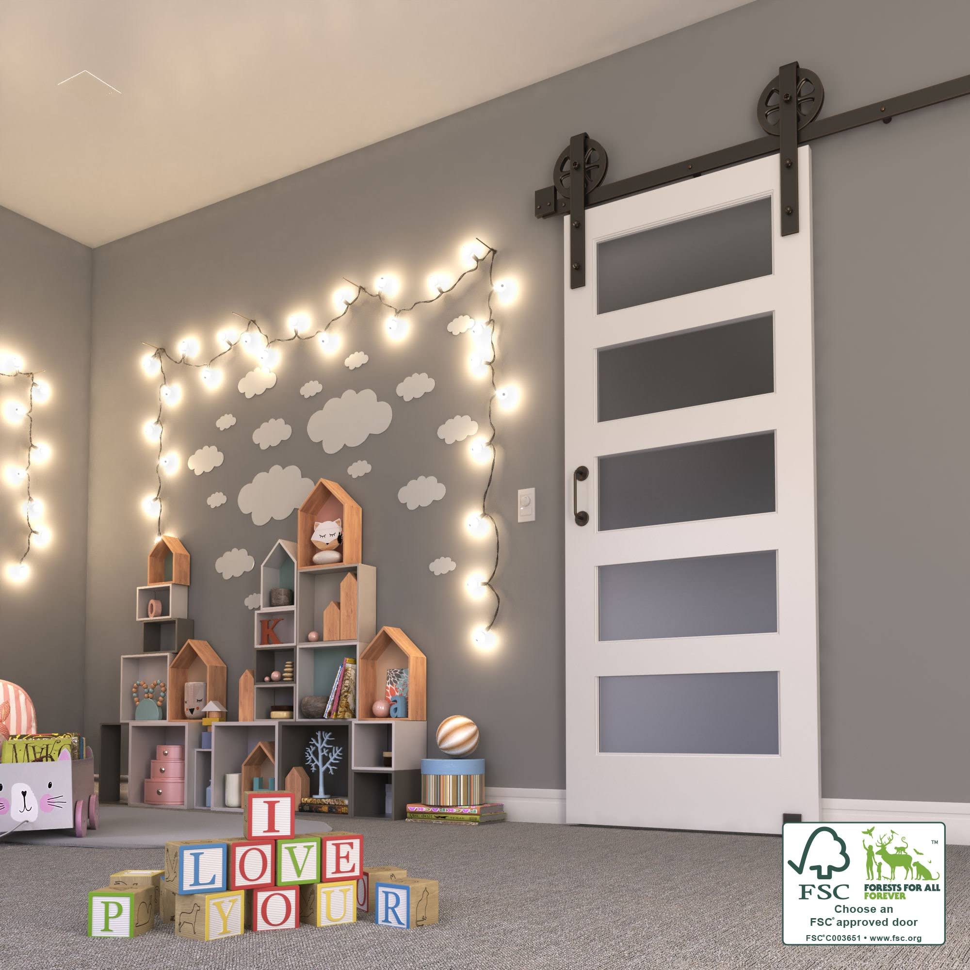 EightDoors 84" x 32" 5-Lite Frosted Glass White Prefinished Solid Wood Core Barn Door