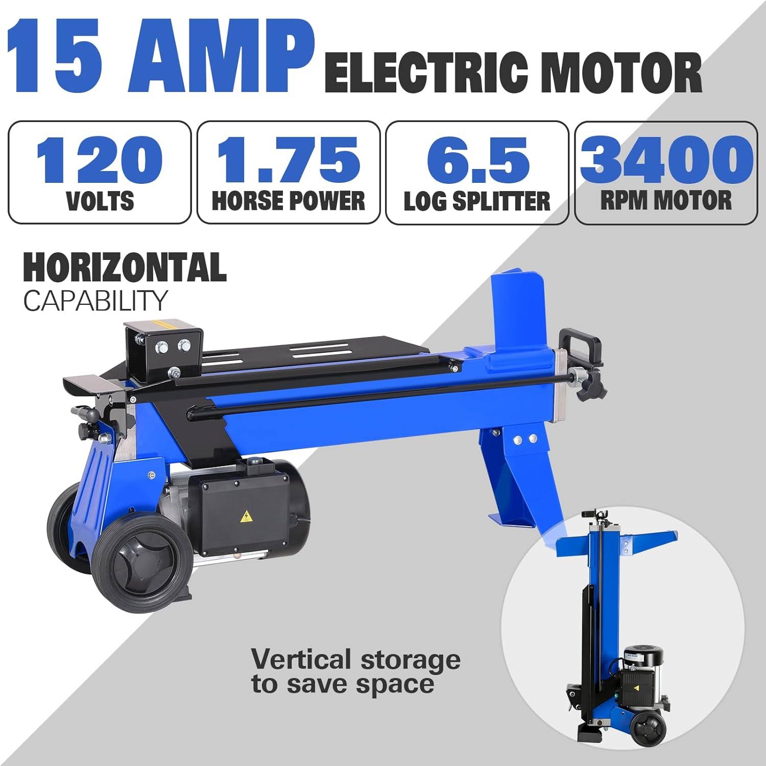 Bilt Hard Log Splitter 6.5 Ton, Wood Splitter Electric Powered 15Amp, with Hydraulic Ram, Electric Firewood Splitting Machine, Horizontal