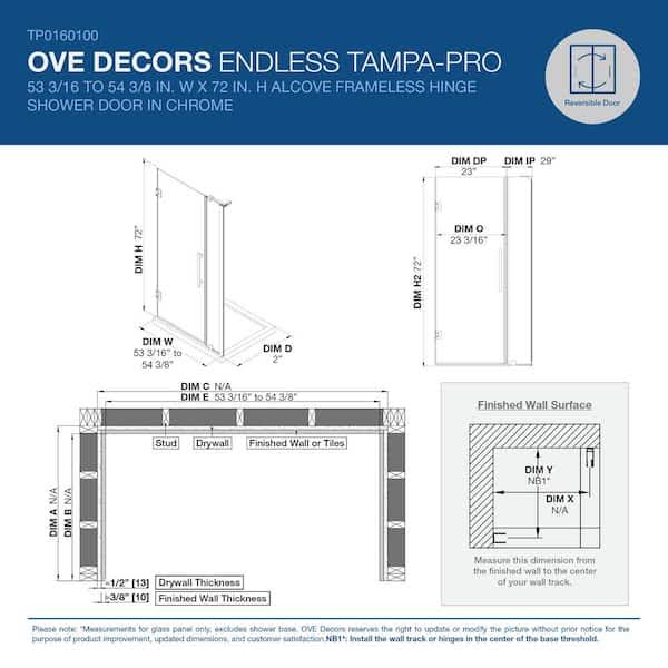 Ove Decors Tampa-Pro 54 3/8 in. W x 72 in. H Pivot Frameless Shower in SN