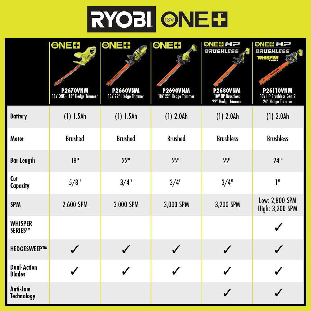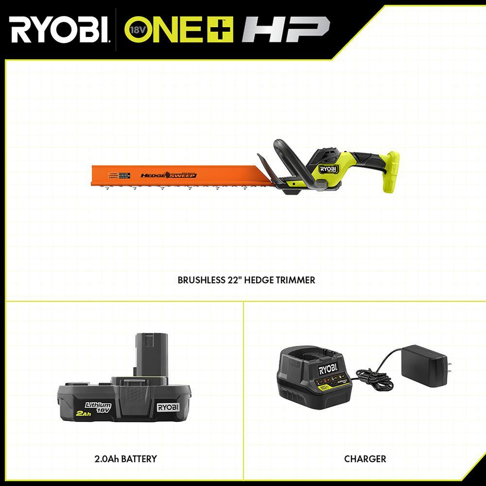 RYOBI P2680 ONE+ HP 18V Brushless 22 in. Cordless Battery Hedge Trimmer with 2.0 Ah Battery and Charger