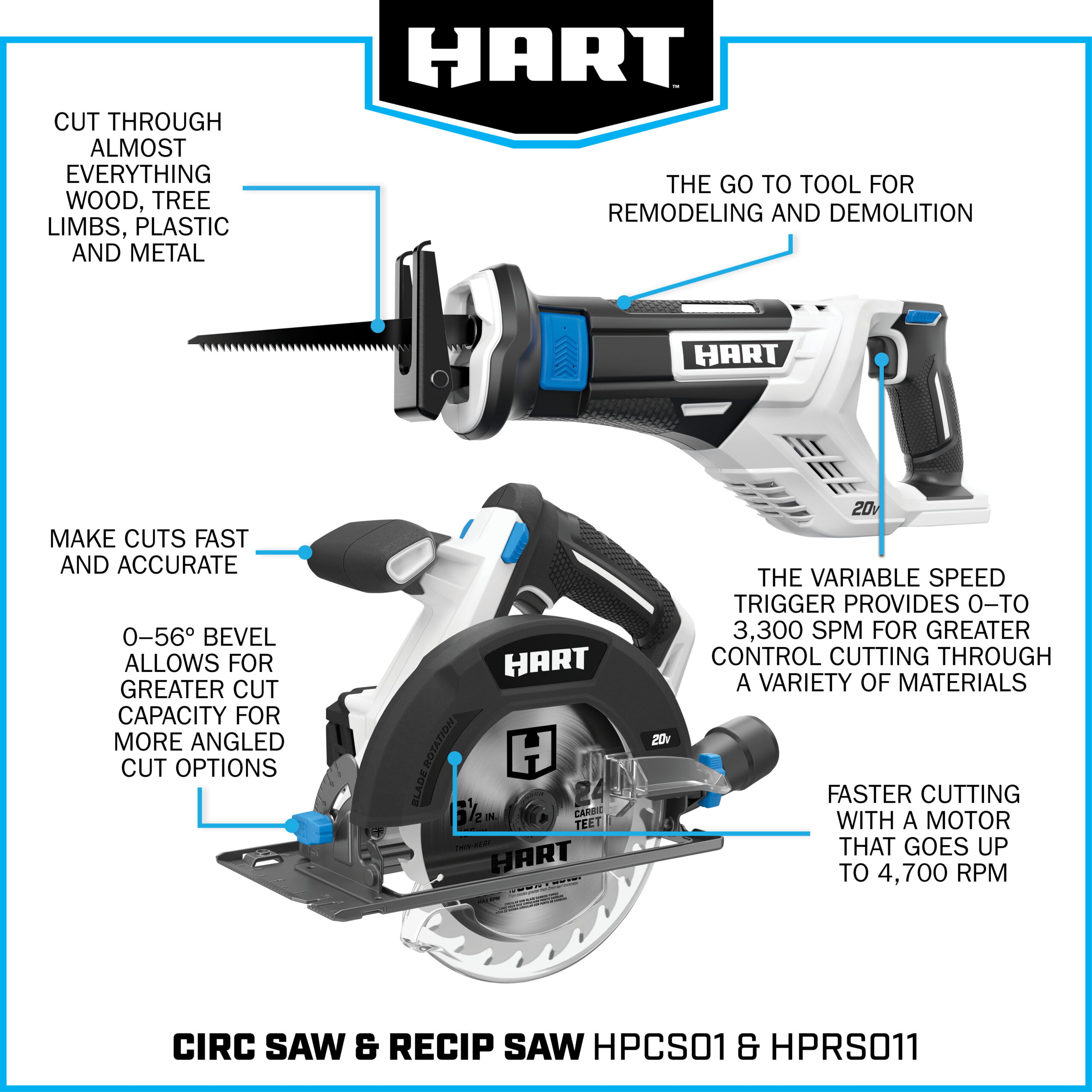 HART 20-Volt Cordless 6-Tool Combo Kit (1) 4.0Ah & (1) 1.5Ah Lithium-Ion Batteries. Charger and Storage Bag