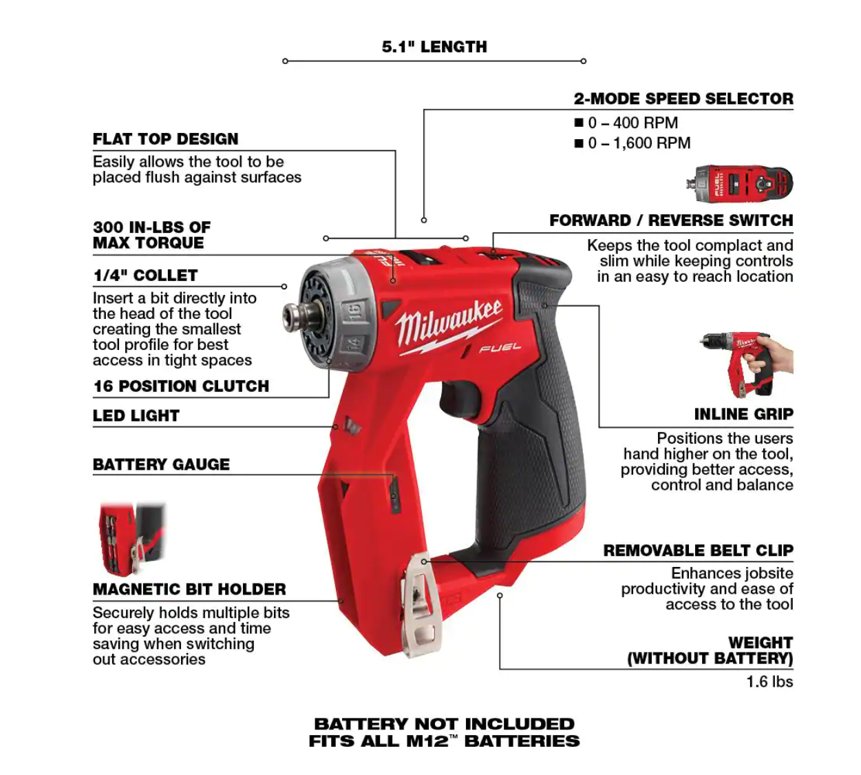 Milwaukee 2505-20 M12 FUEL 12-Volt Lithium-Ion Brushless Cordless 4-in-1 Installation 3/8 in. Drill Driver with 4 Tool Head (Tool-Only)