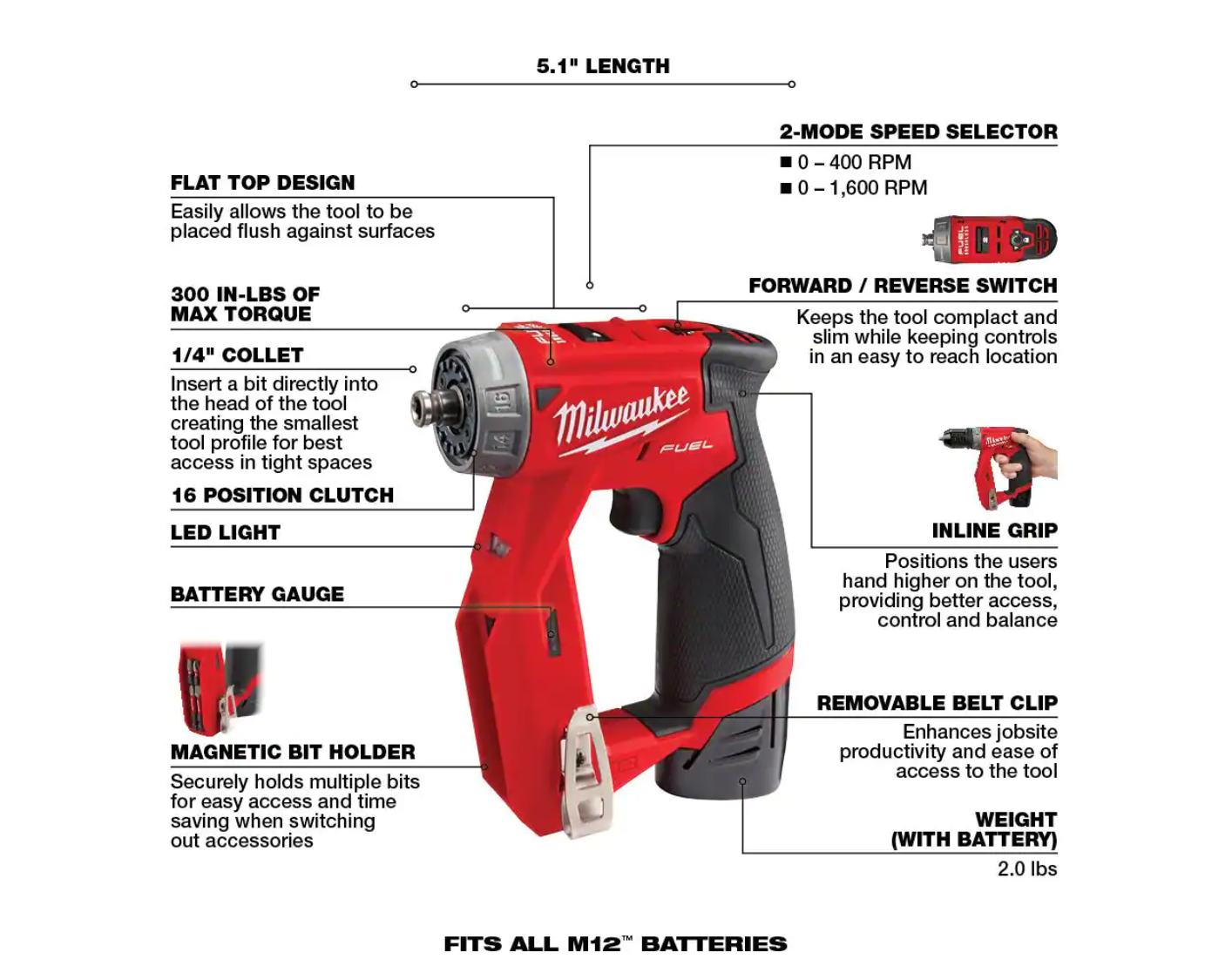 Milwaukee 2505-22-48-11-2460 M12 FUEL 12-Volt Lithium-Ion Brushless Cordless 4-in-1 Interchangeable 3/8 in. Drill Driver Kit with 6.0 Ah Battery
