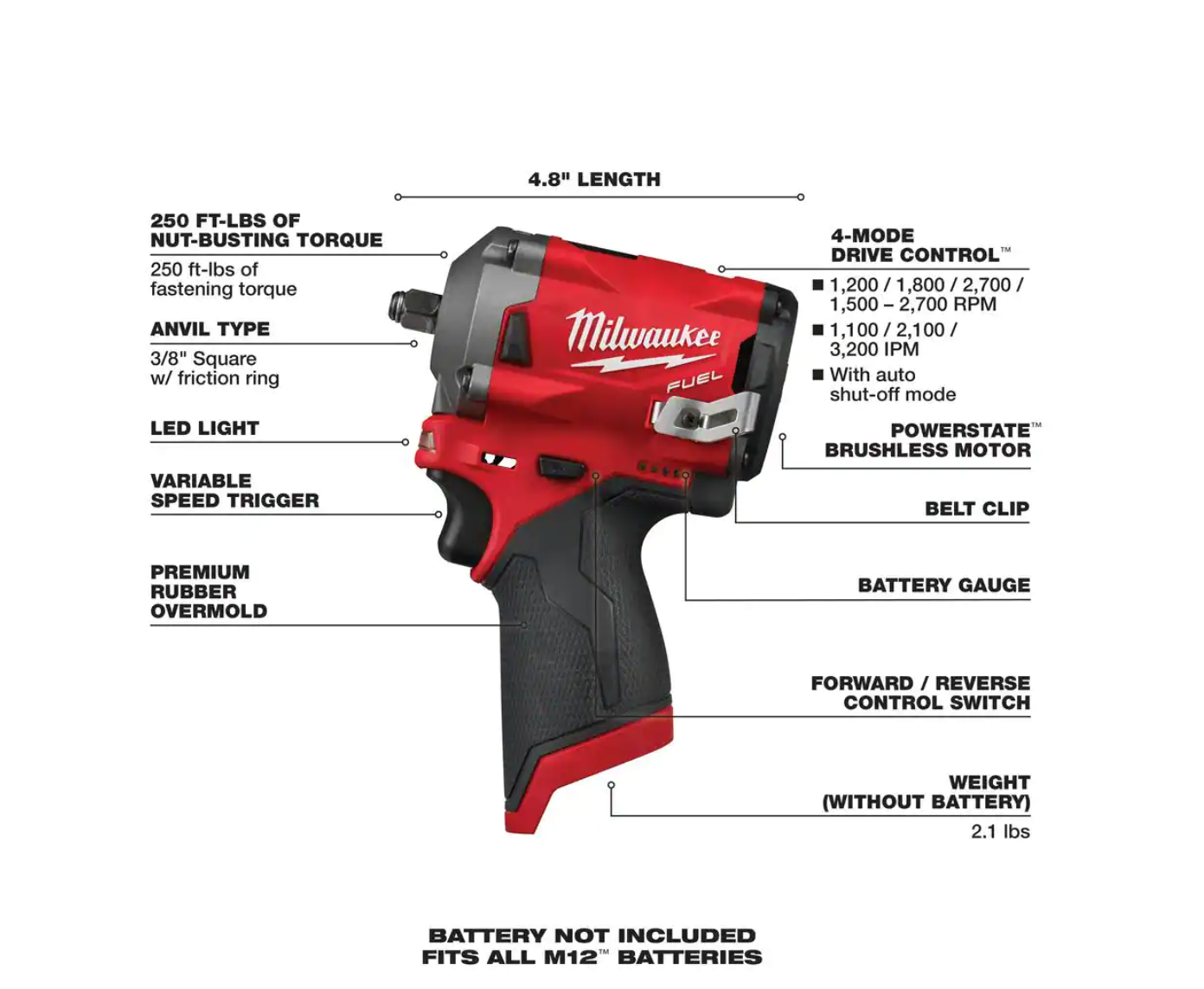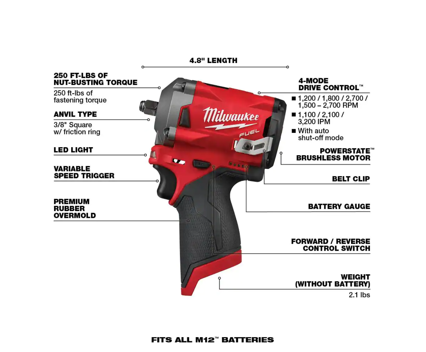 Milwaukee 2554-20-2557-20 M12 FUEL 12V Lithium-Ion Brushless Cordless Stubby 3/8 in. Impact Wrench and Ratchet Kit (Tool-Only Kit)