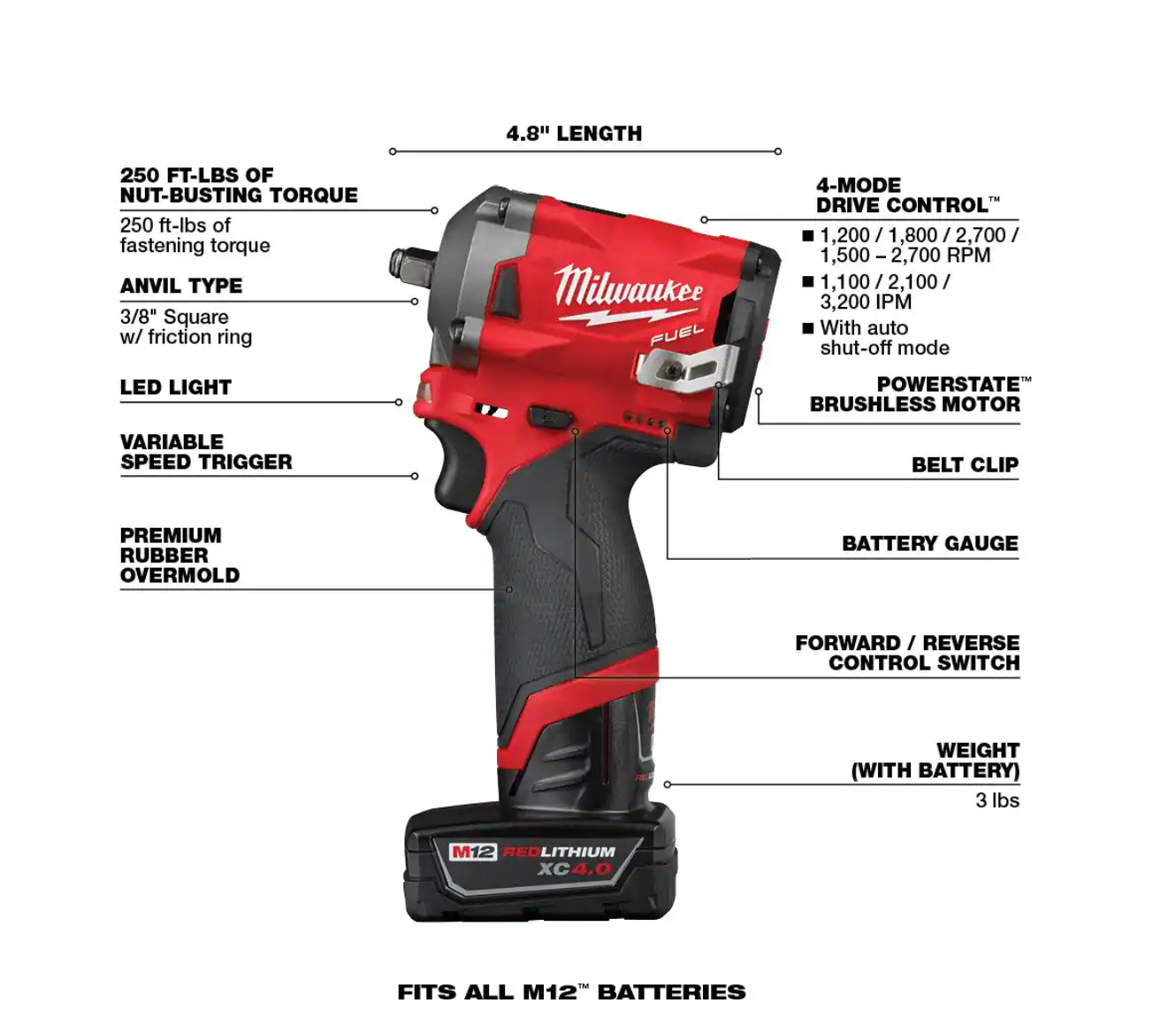 Milwaukee 2554-22-2457-20 M12 FUEL 12V Lithium-Ion Brushless Cordless Stubby 3/8 in. Impact Wrench Kit with M12 3/8 in. Ratchet