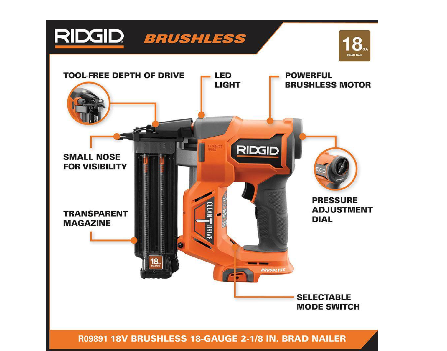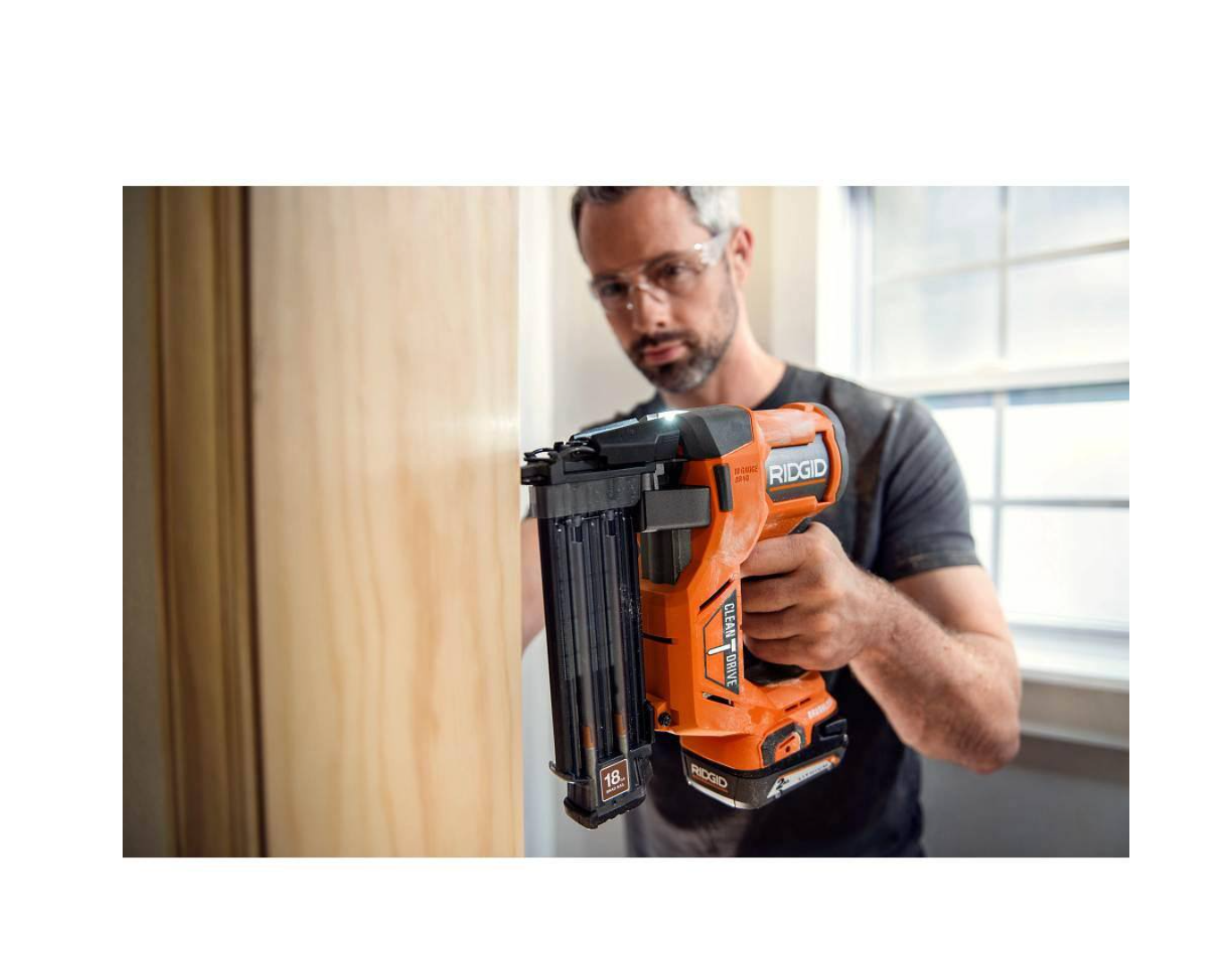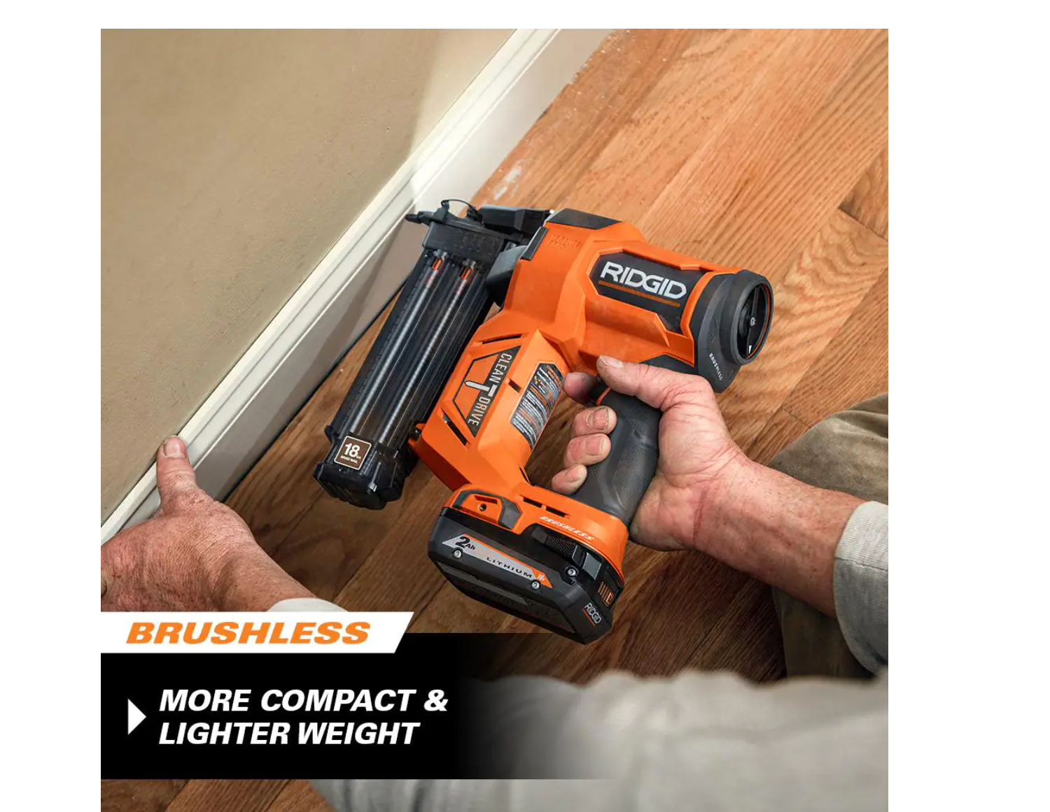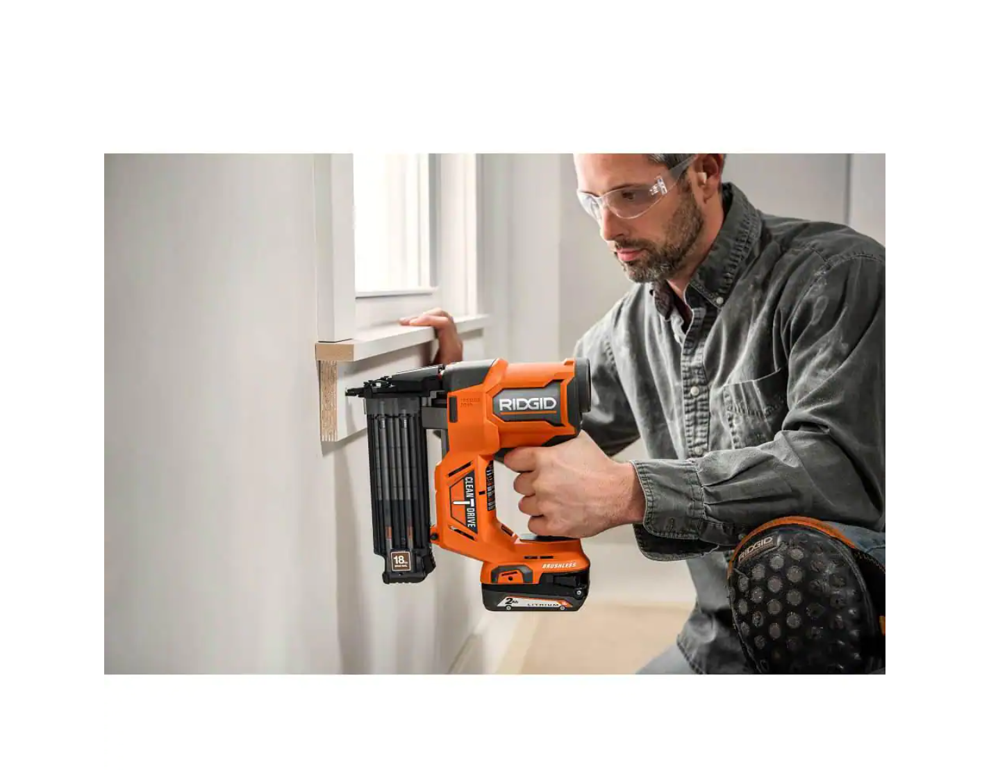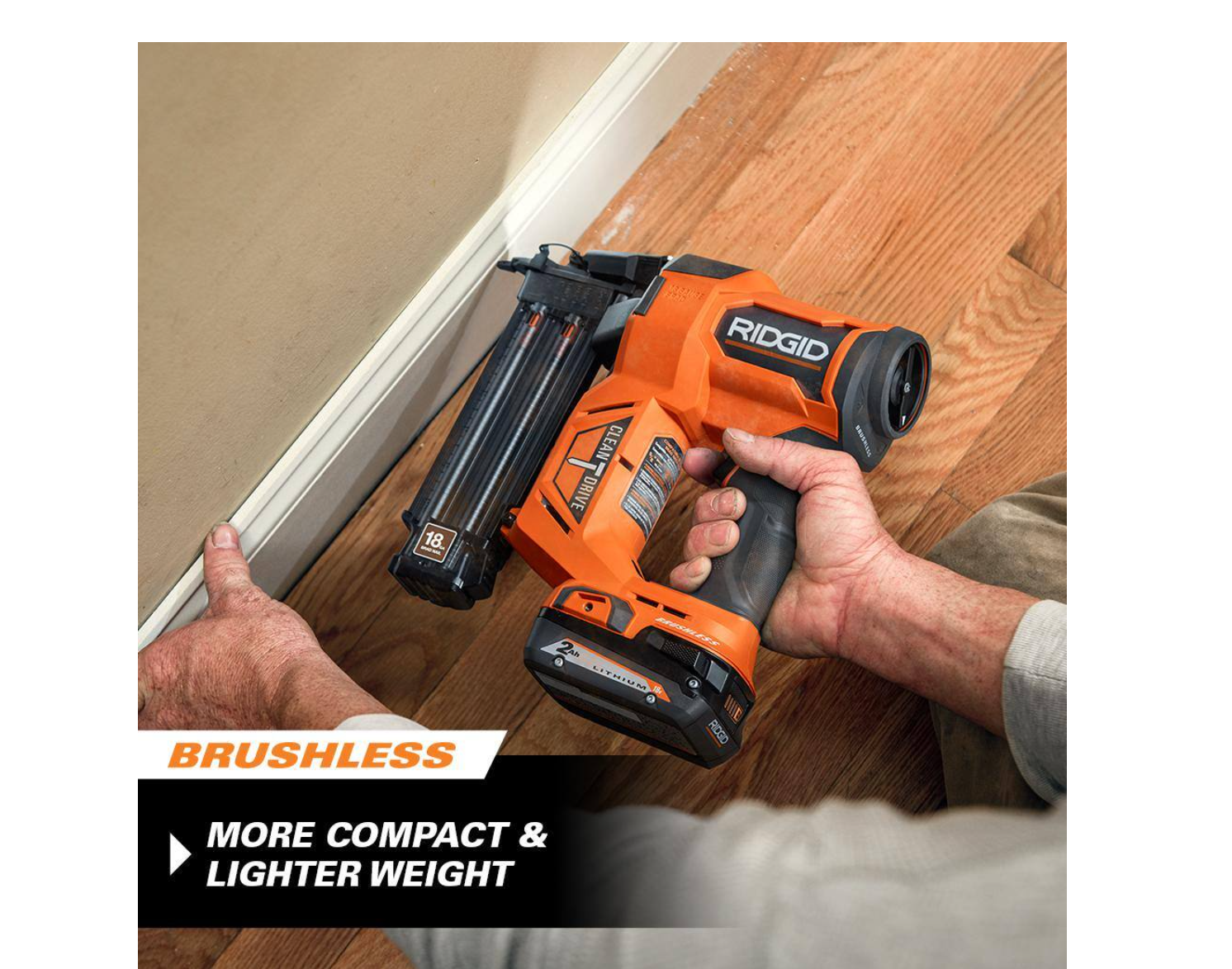 RIDGID R09891K 18V Brushless Cordless 18-Gauge 2-1/8 in. Brad Nailer with CLEAN DRIVE Technology with 2.0 Ah Battery and Charger