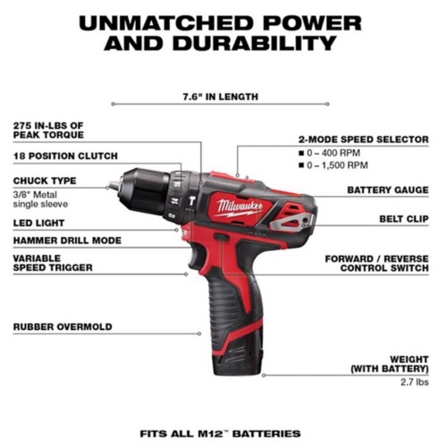 Milwaukee M12 12V 3/8 in Brushed Cordless Hammer Drill Kit (Battery & Charger)