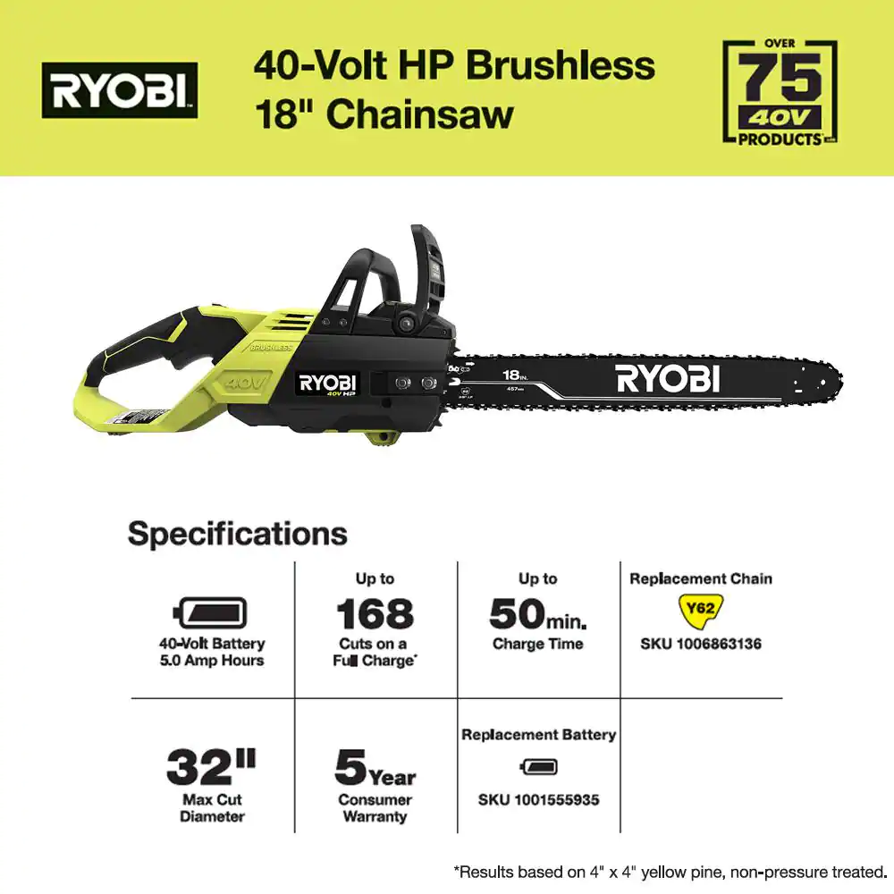 RYOBI RY40580 40V HP Brushless 18 in. Cordless Battery Chainsaw with 5.0 Ah Battery and Charger