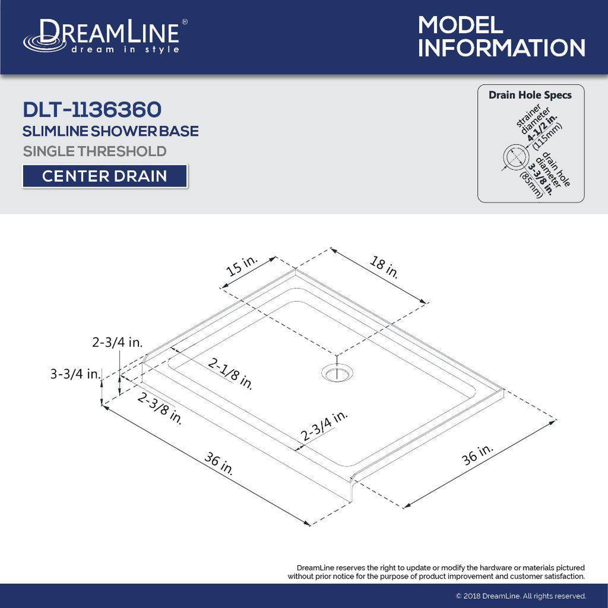 DreamLine DLT-1136360 Slimline 36-Inch x 36-Inch Single Threshold Shower Base White