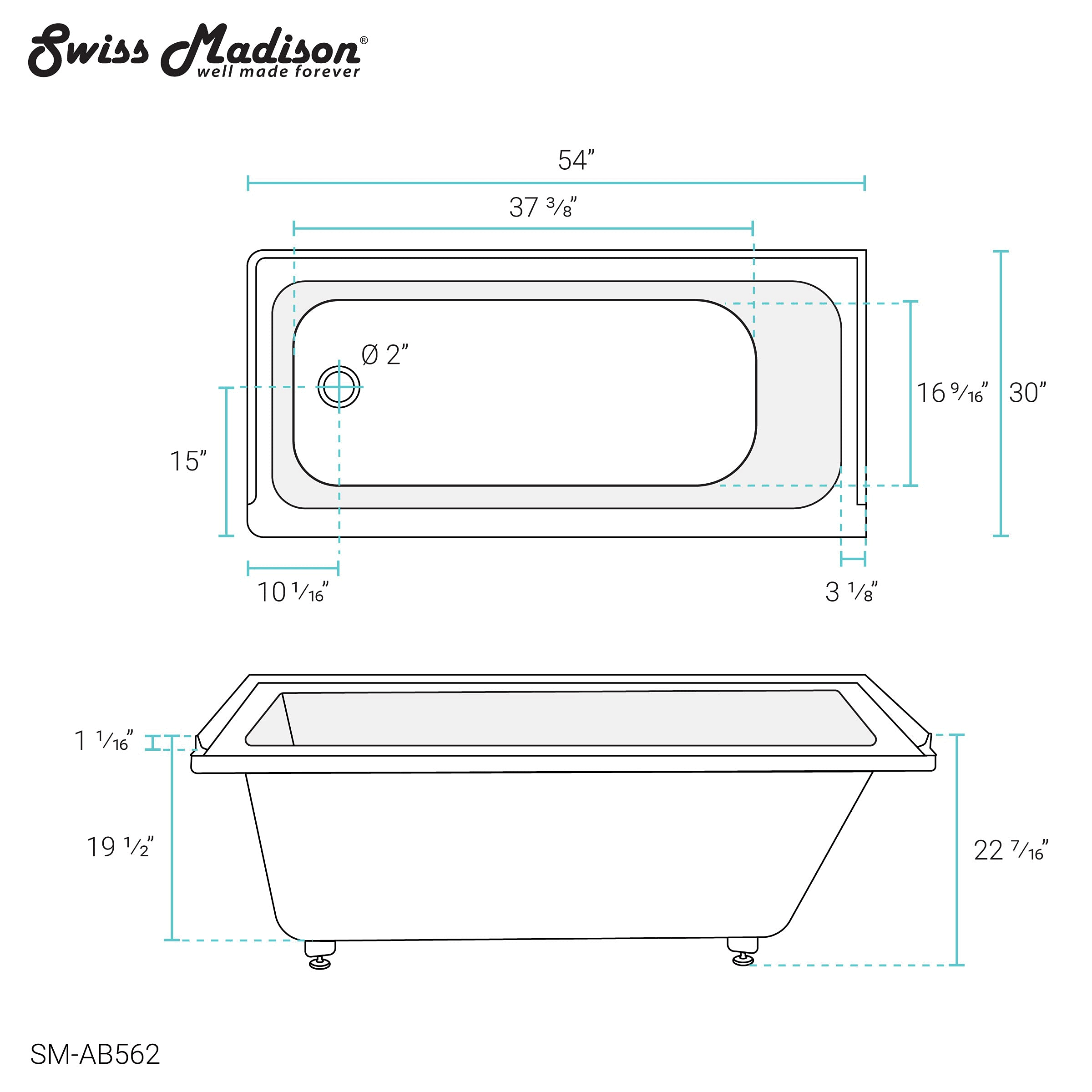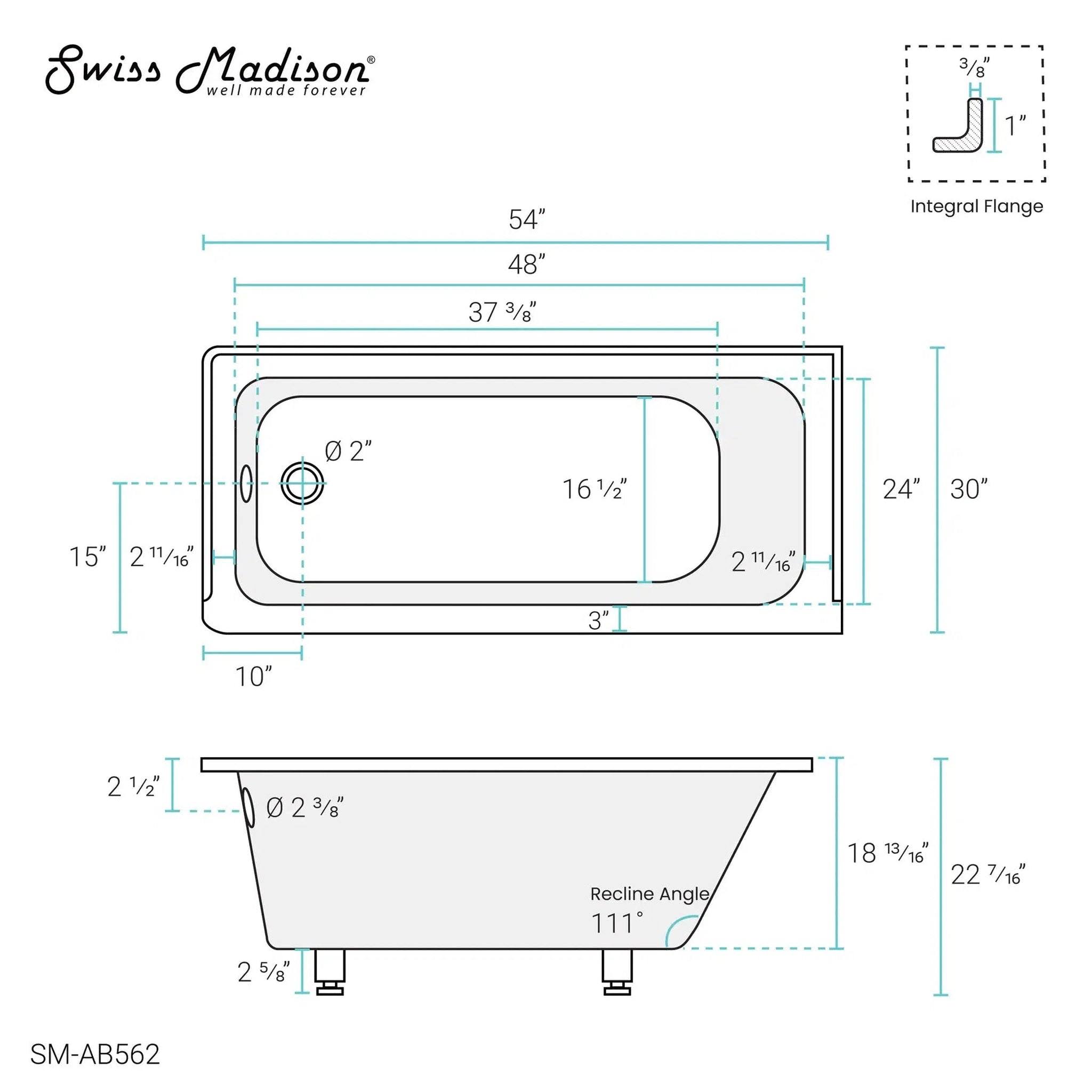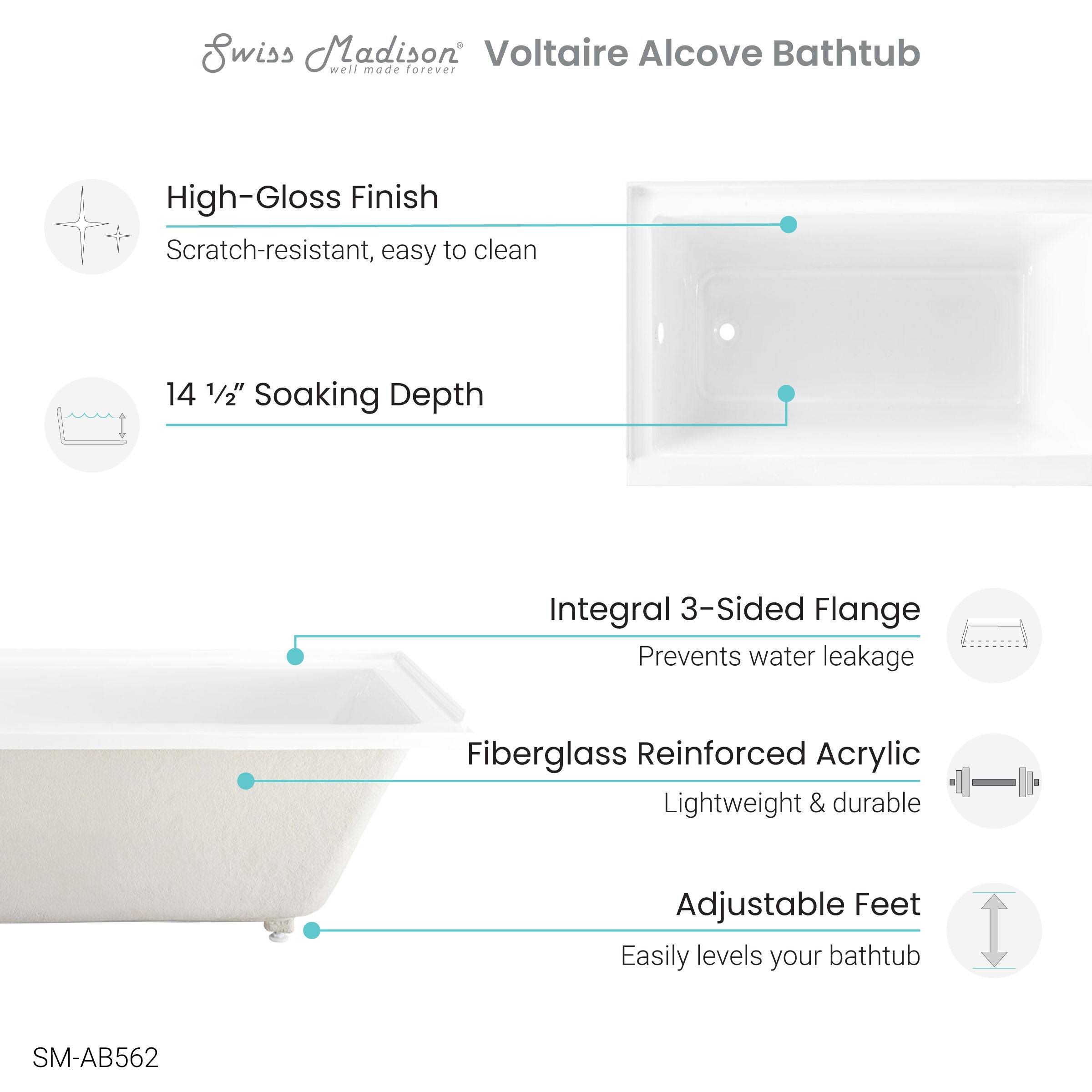 Swiss Madison Voltaire 54 in x 30 in Acrylic Glossy White, Alcove, Integral Left-Hand Drain, Bathtub SM-AB562