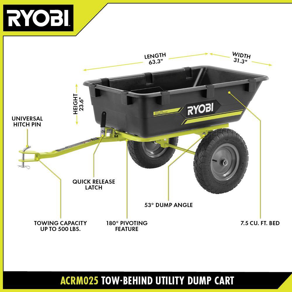 RYOBI ACRM025 500 lb. 7.5 cu. ft. Tow-Behind Utility Dump Cart with Universal Hitch for Riding Mower. Lawn Tractor & Zero Turn Mower