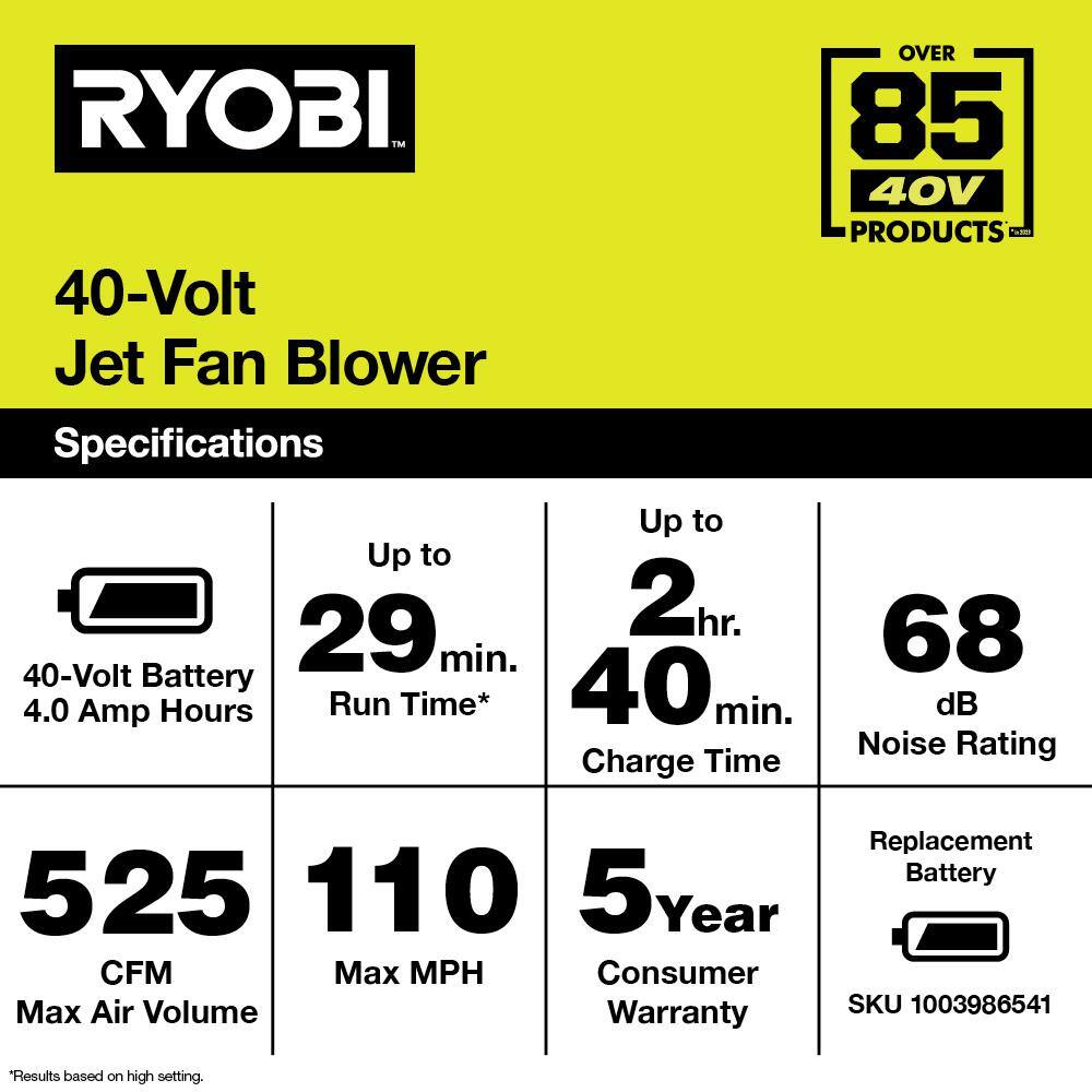 RYOBI RY40480 40V 110 MPH 525 CFM Cordless Battery Variable-Speed Jet Fan Leaf Blower with 4.0 Ah Battery and Charger