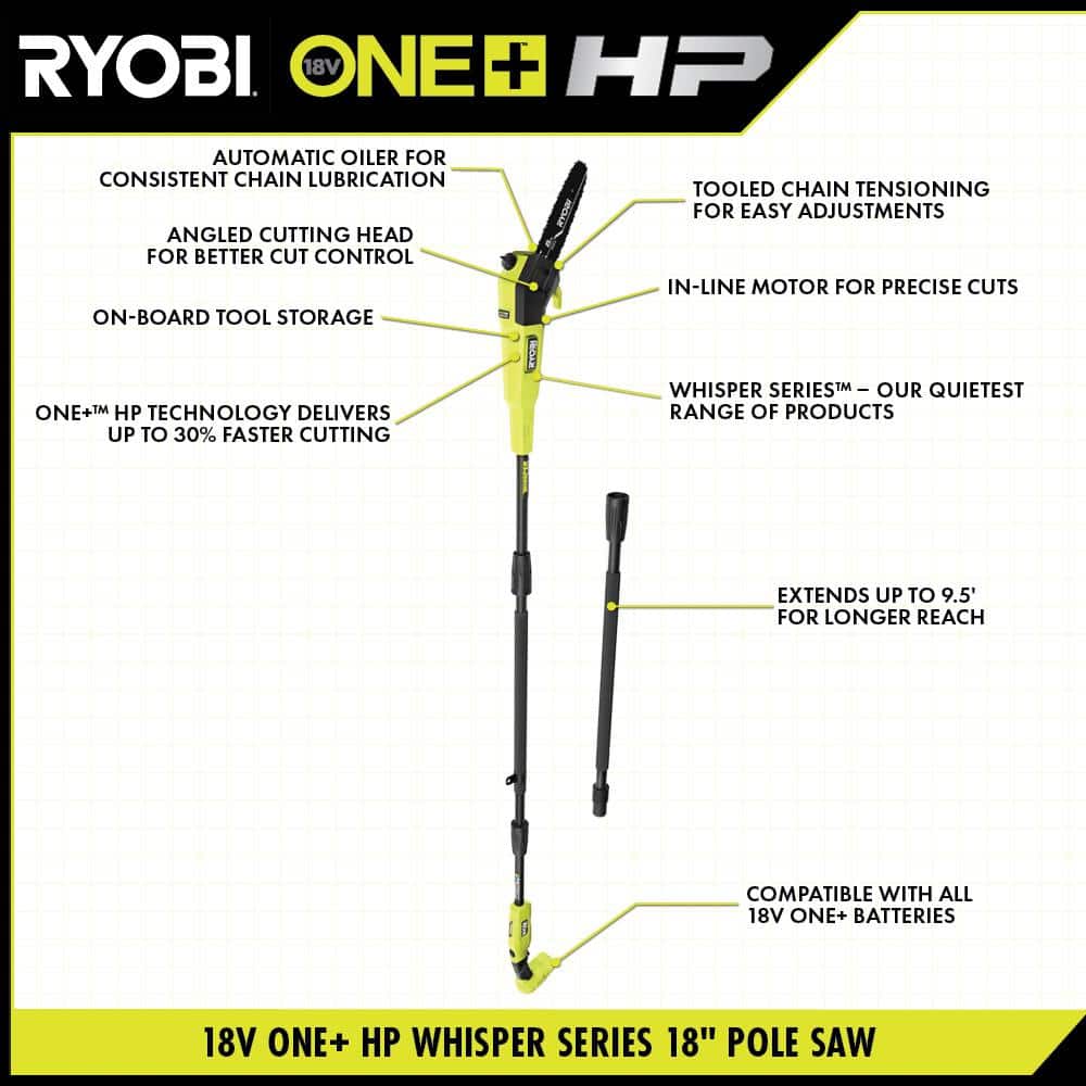 RYOBI ONE+ HP 18V Brushless Whisper Series 8 in. Cordless Battery Pole Saw with 2.0 Ah Battery and Charger