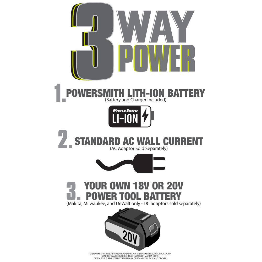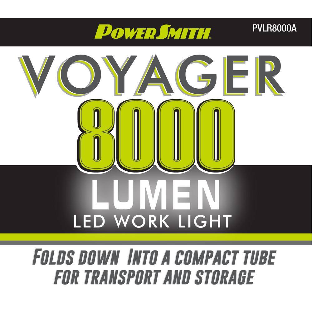 PowerSmith PVLR8000A Voyager 8000 Lumen Collapsible Cordless Tripod LED Work Light w/ Battery. Charger. Bag and remote. Optional 3-Way Power