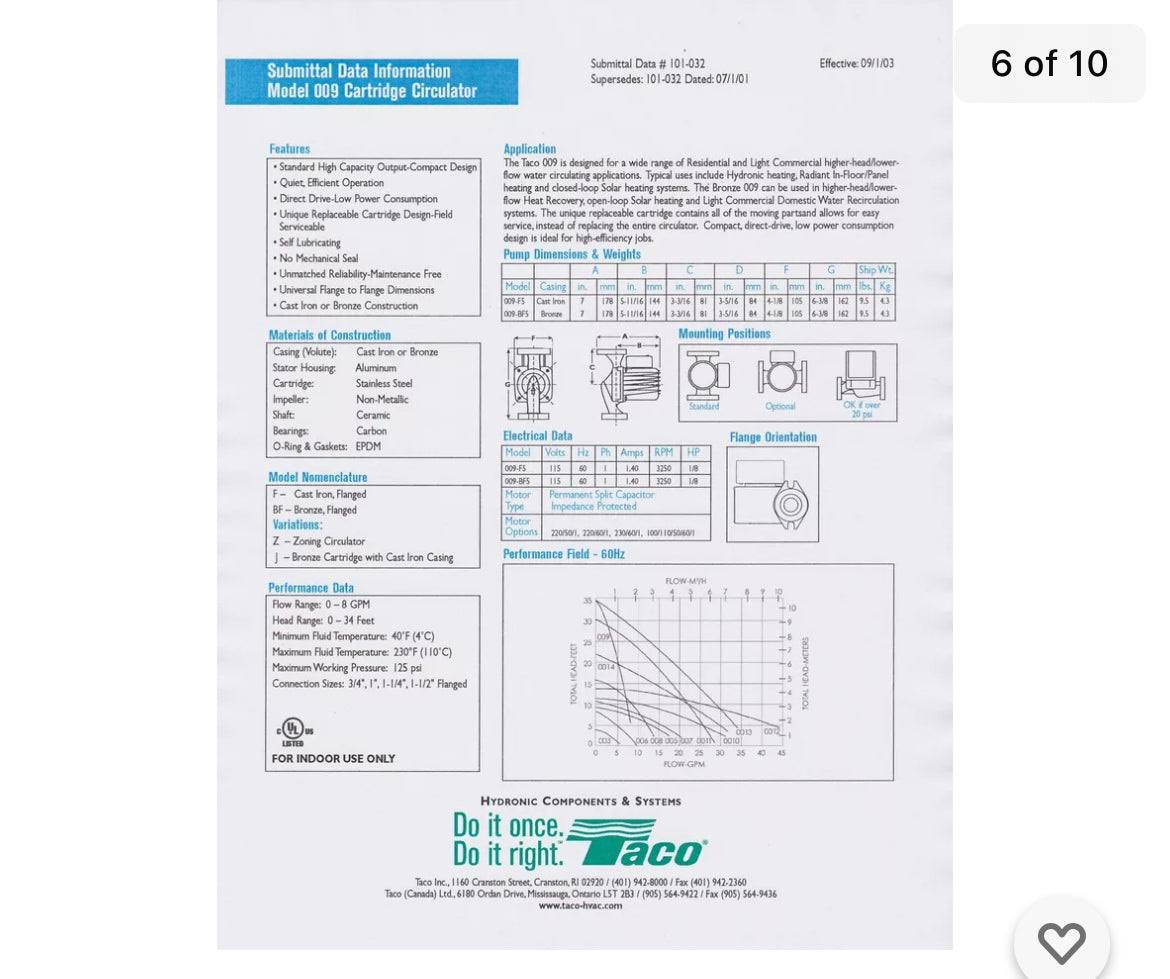 Taco 009-BF5-J Circulating Pump Cast Iron with Bronze Cartridge for Longer Life