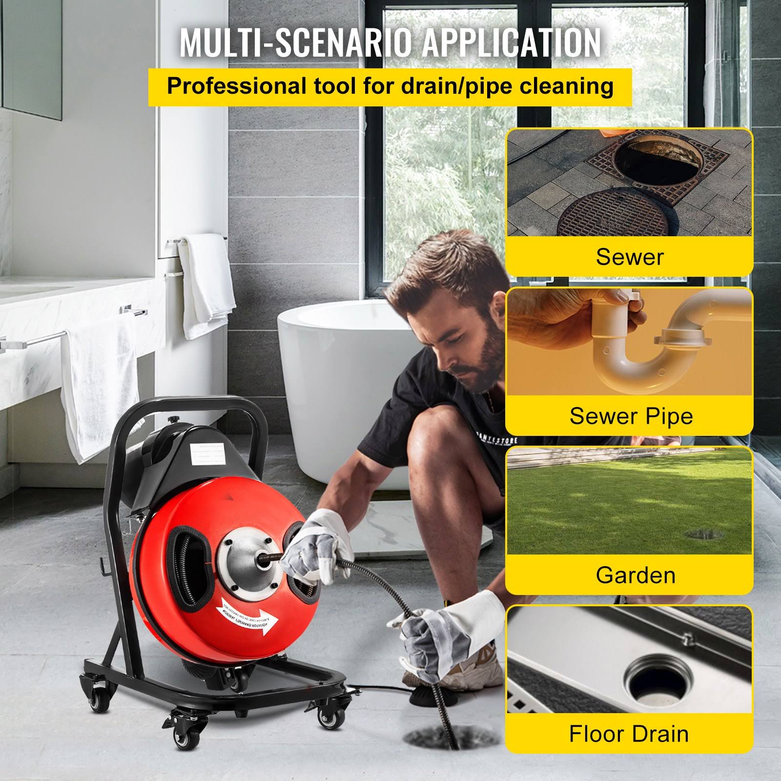VEVOR Drain Cleaner Machine Electric Drain Auger 50FTX1/2IN Cable 370W w/Wheels