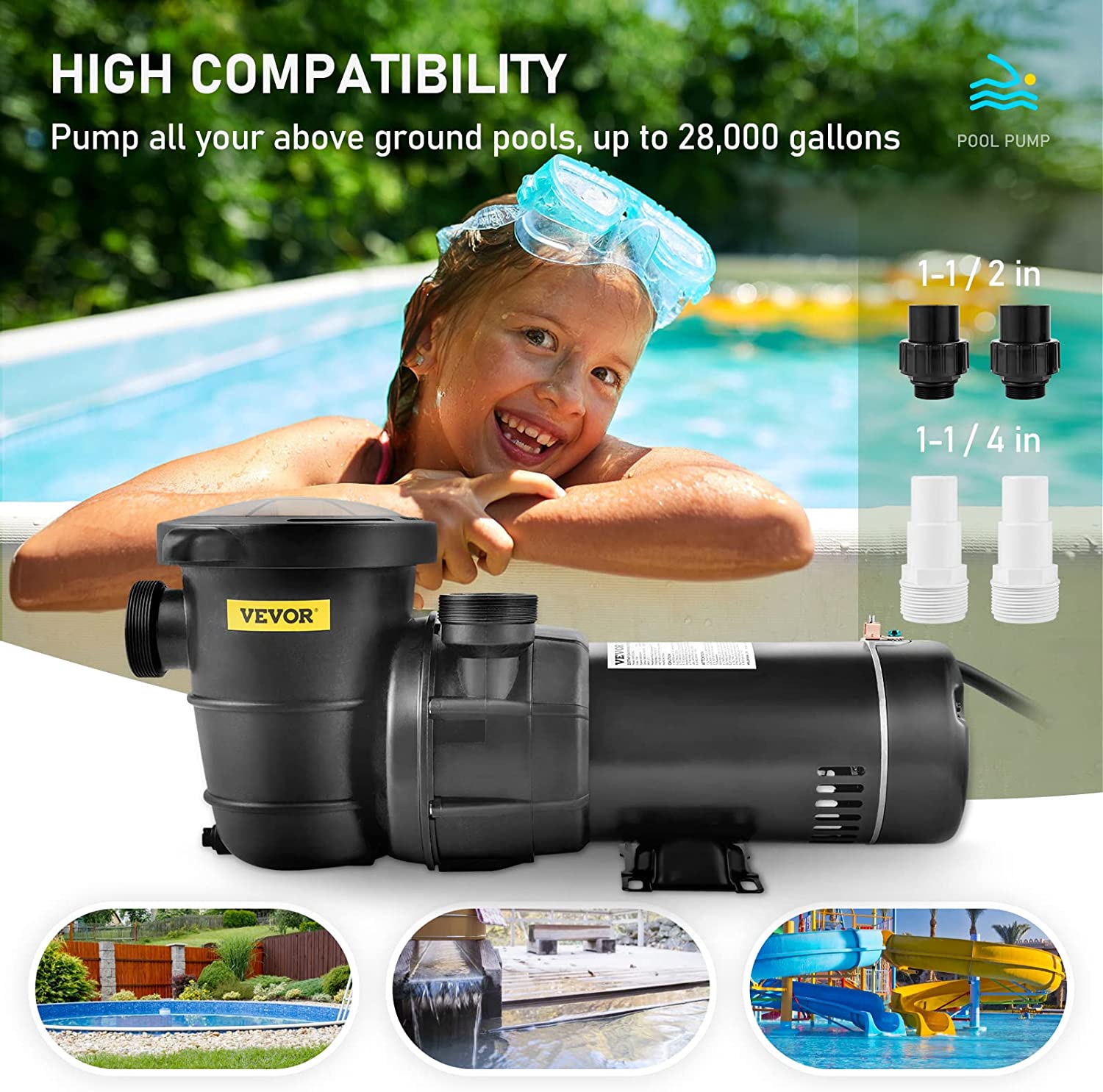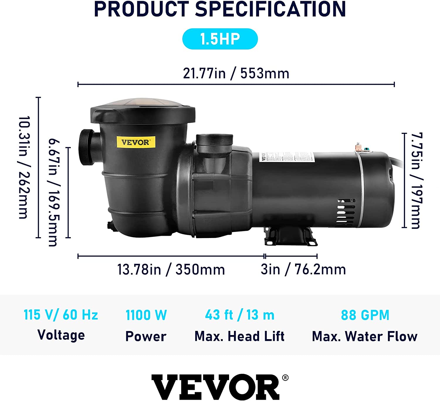 VEVOR Pool Pump Aboveground 1.5HP 115V. Single Speed. 5280GPH 1100W Powerful Swimming Pool Pump. Self Primming Pool Filtre Pump with Strainer Basket. 4 Pipe Fittings. Low Noise