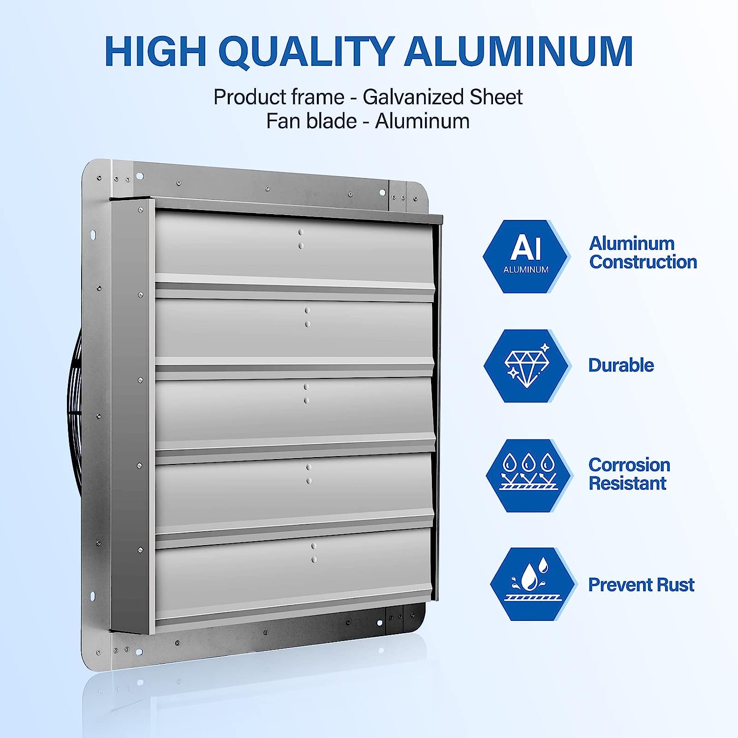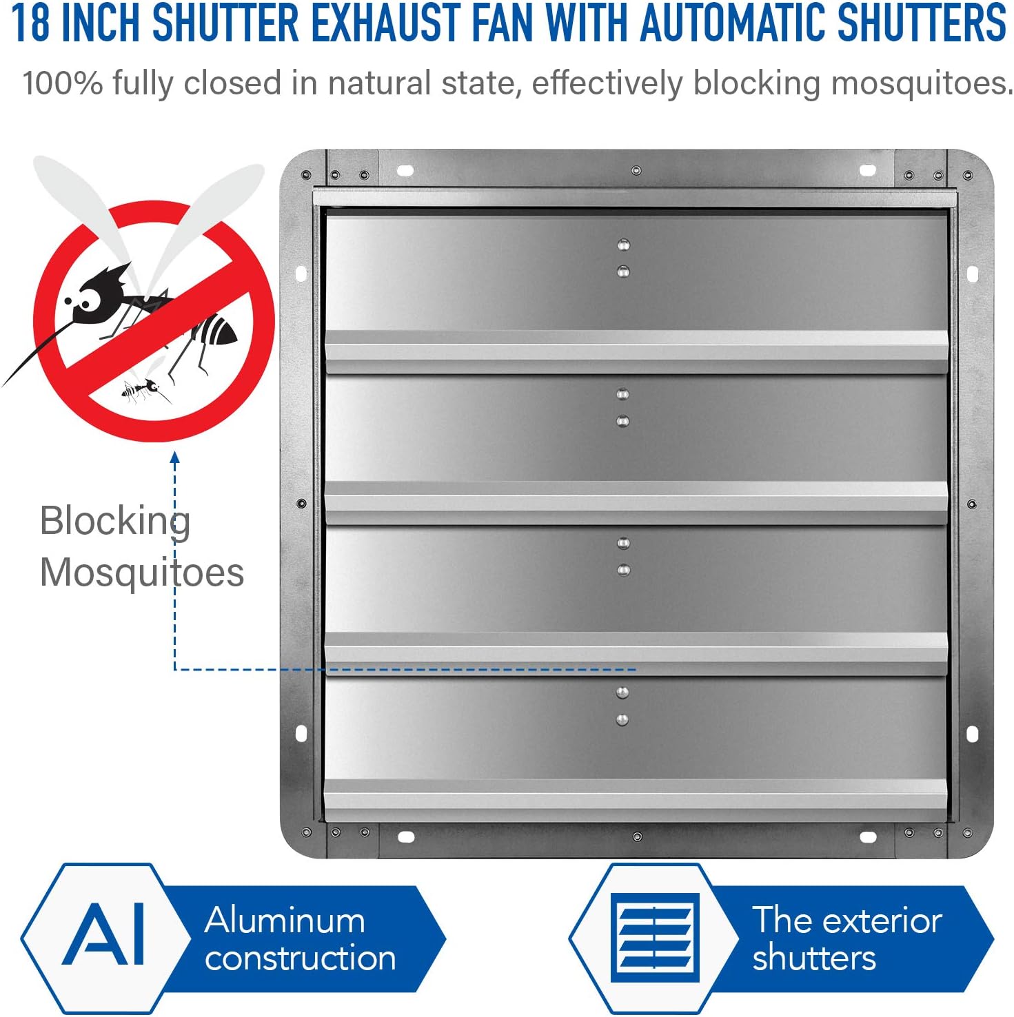 iPower 18 Inch Shutter Exhaust Fan Aluminum.High Speed 1450 RPM. 2000 CFM. 1-Pack. 21.3″D x 21.3″W x 9″H. Silver