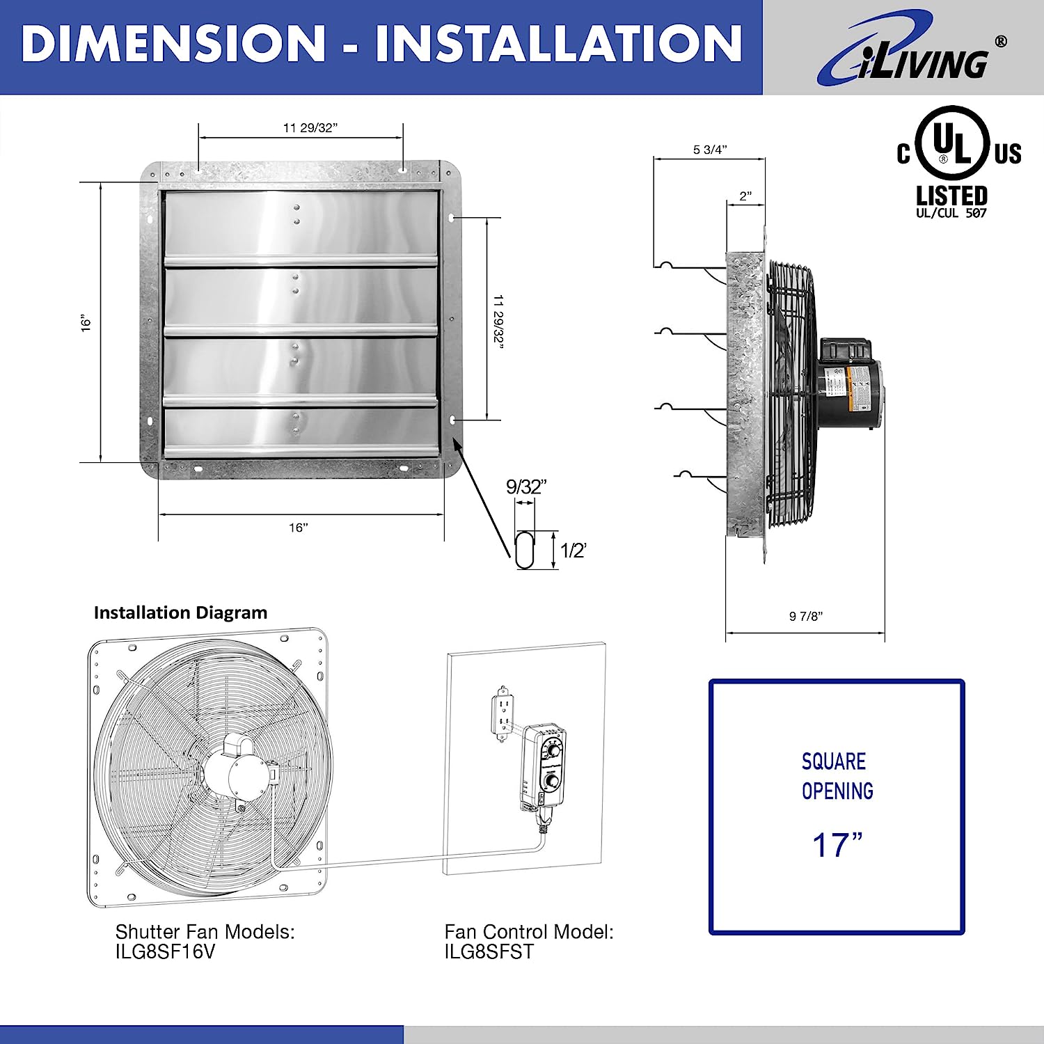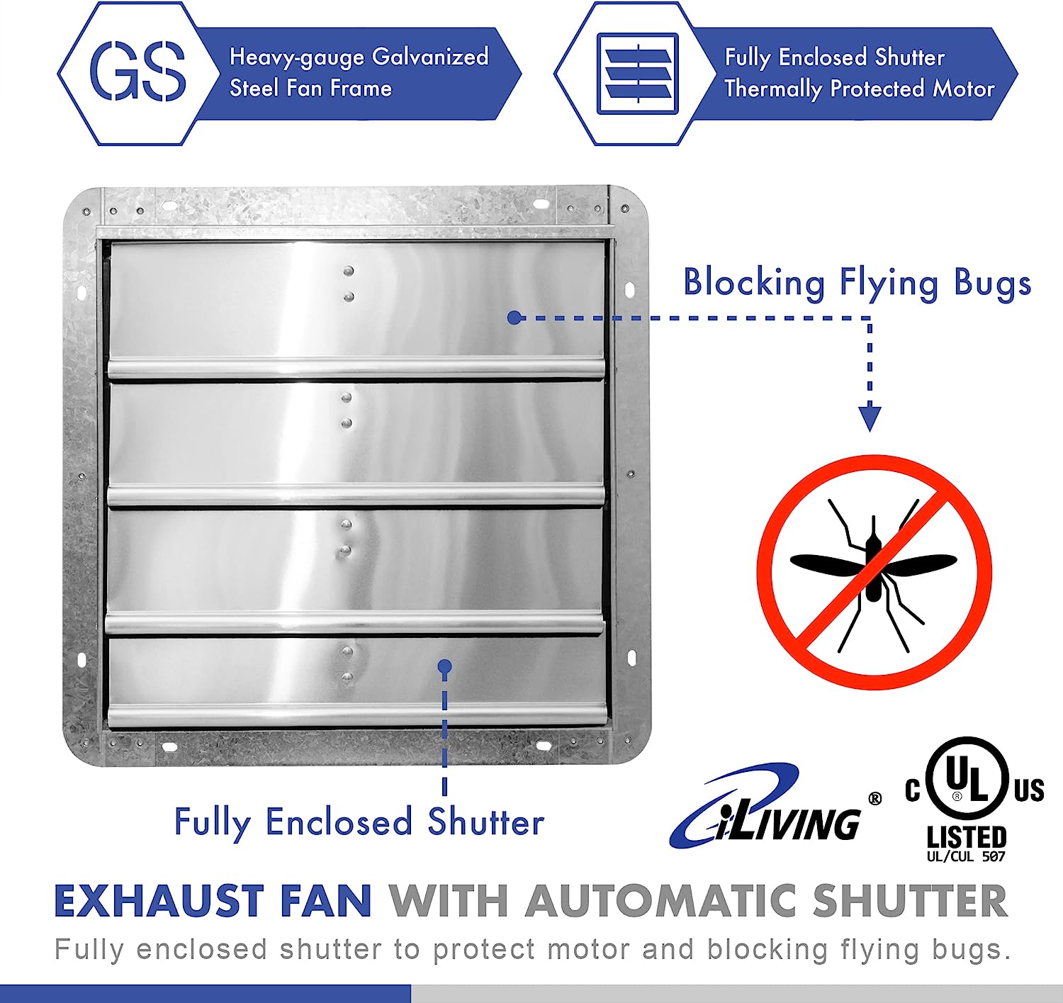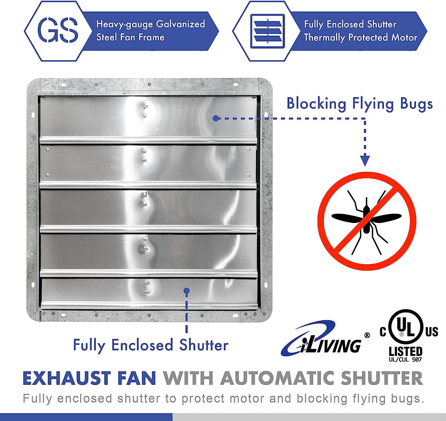 iLIVING 16″ Wall Mounted Shutter Exhaust Fan. Automatic Shutter. with Thermostat and Variable Speed controller. 0.85A. 1200 CFM. 1800 SQF Coverage Area Silver (ILG8SF16V-ST)