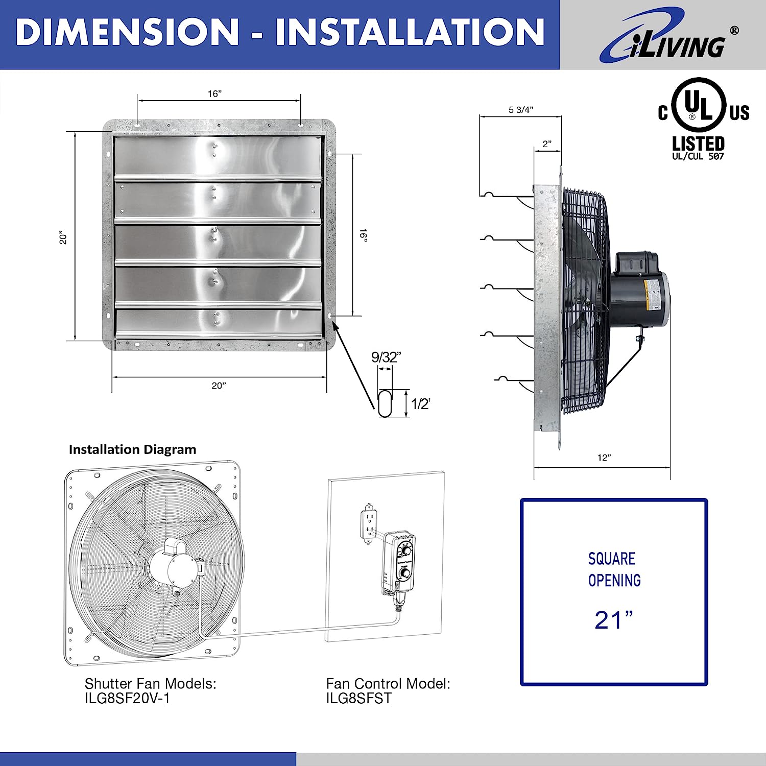 iLIVING 20″ Wall Mounted Shutter Exhaust Fan. Automatic Shutter. with Thermostat and Variable Speed controller. 2.2A. 3368 CFM. 5000 SQF Coverage Area Silver (ILG8SF20V-ST)