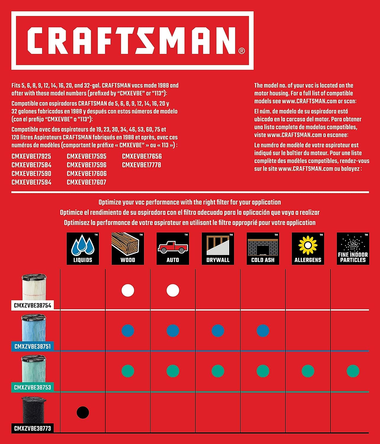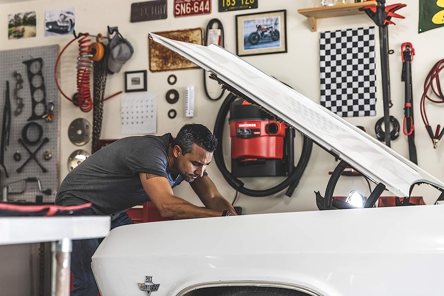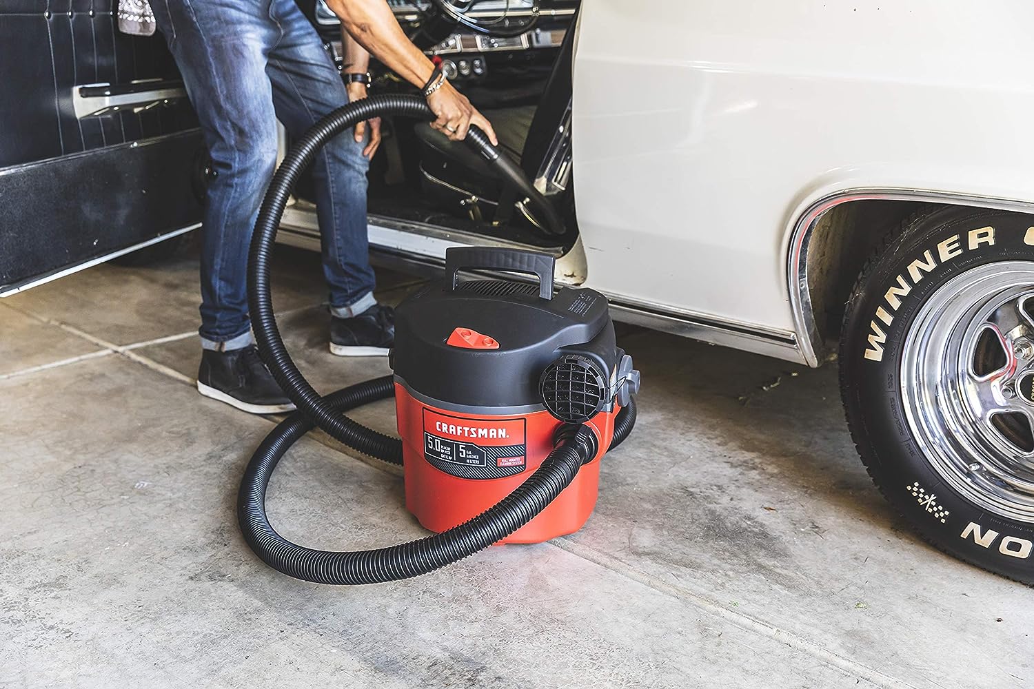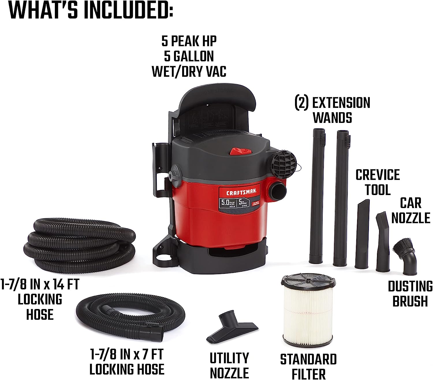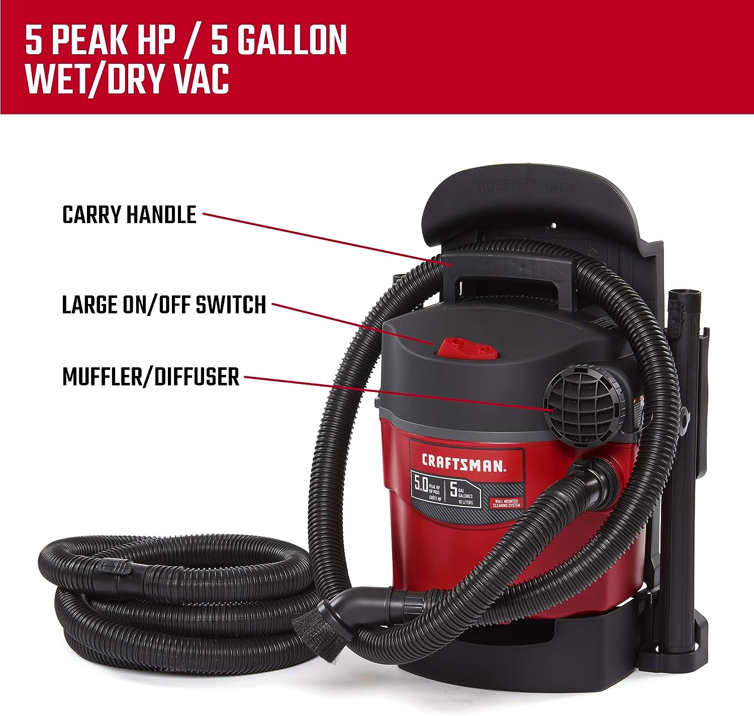 CRAFTSMAN CMXEVBE17925 5 Gallon 5.0 Peak HP Wet/Dry Wall Vac. Wall-Mounted Shop Vacuum with Attachments.Red